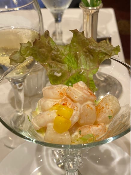 貝柱と小エビのカクテル パッションフルーツのドレッシングで