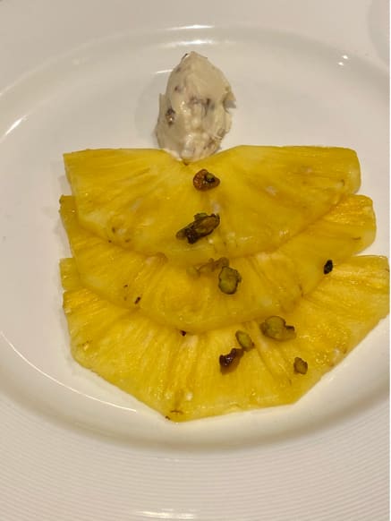 前菜その2アイランドパイナップルと砂糖漬けのピスタチオ ナツメヤシ風味のマスカルポーネチーズと共にパイナップルもピスタチオも好きなので注文してみました。意外とナツメヤシ風味のマスカルポーネチーズが美味しゅうございました。これ、もっと欲しかった。パンにつけて食べてみたいな。