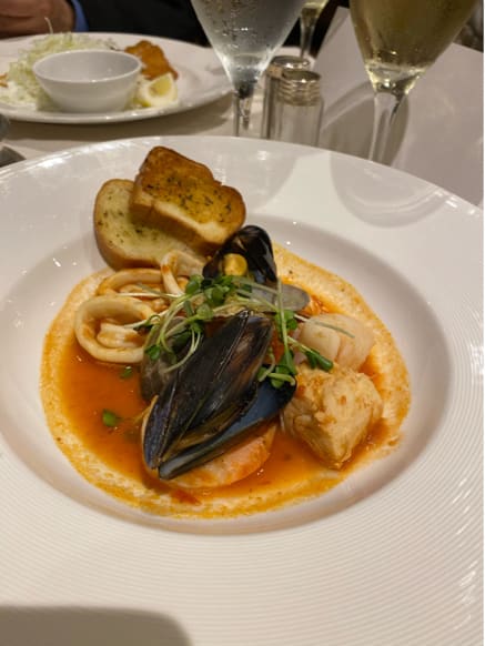 私のメインはサンフランシスコ風チョッピーノシーフードシチュー魚と貝を白ワインとトマトソースで煮込んだ料理。サワー同ガーリッククルトンをちらして。