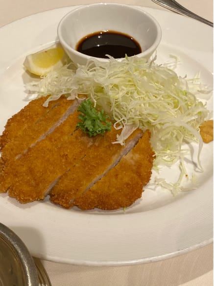 夫のメイン豚カツ パン粉をまぶしてあげた豚カツを和風マスタードソースで、キャベツの千切りを添えてシェフのお勧めメニューとなっておりました。ちょっと薄いけど、これも美味しかったようですわ。