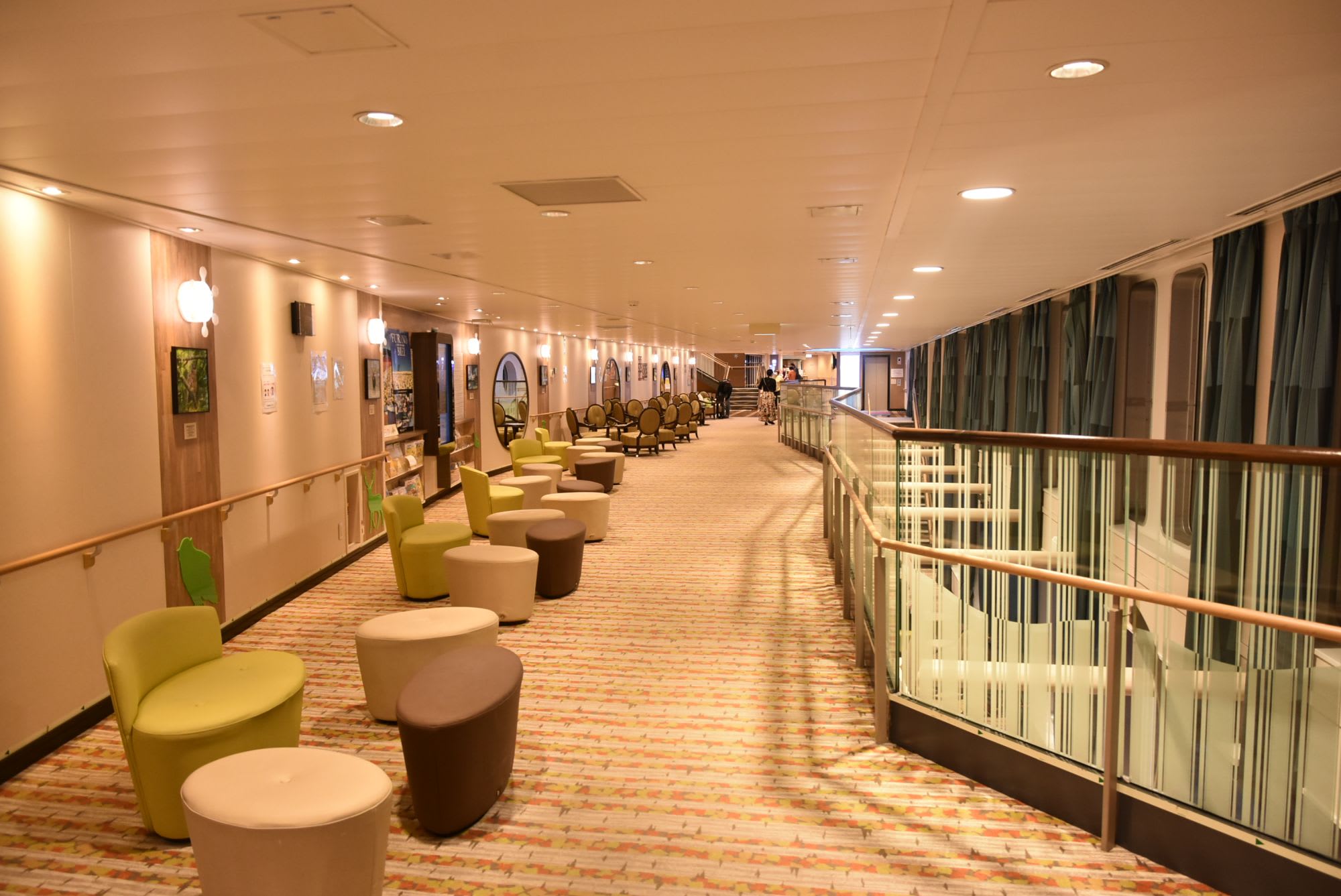 この船の場合、パブリックスペースもかなり広くとってあり、デッキ5とデッキ6の右舷側に有るプロムナードにはテーブルや椅子がかなりの数置いてあって海を展望できるので、ハイシーズンでなければ船旅をかなり楽しめるのではないでしょうか。