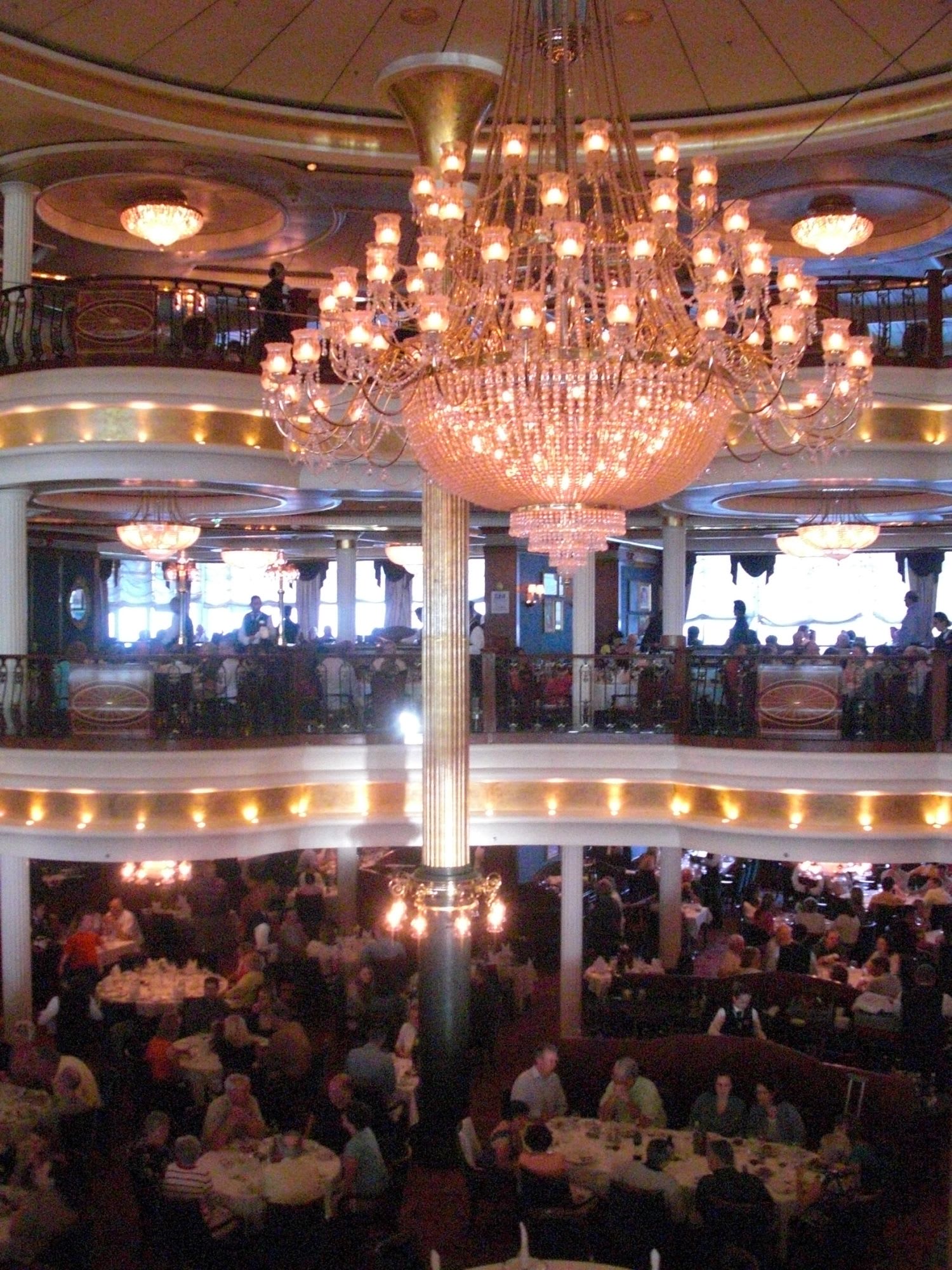 同じく船内とは思えない大きさの劇場や、圧巻のシャンデリアがゴージャスさを際立たせているメインダイニング。