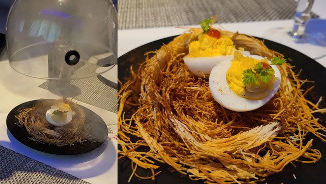 スモークの香り付けされたゆで卵に、ホットソースが添えられていました。