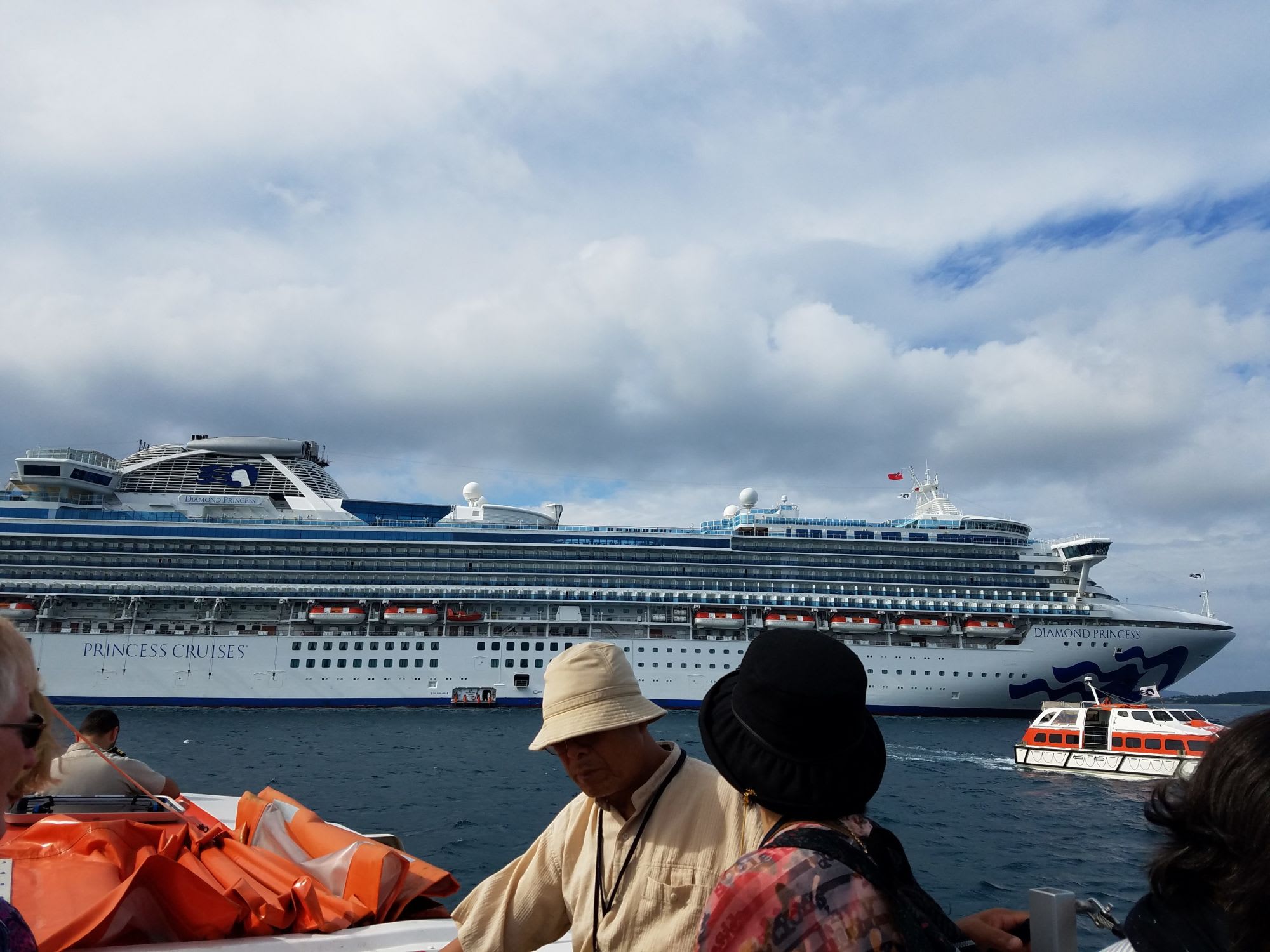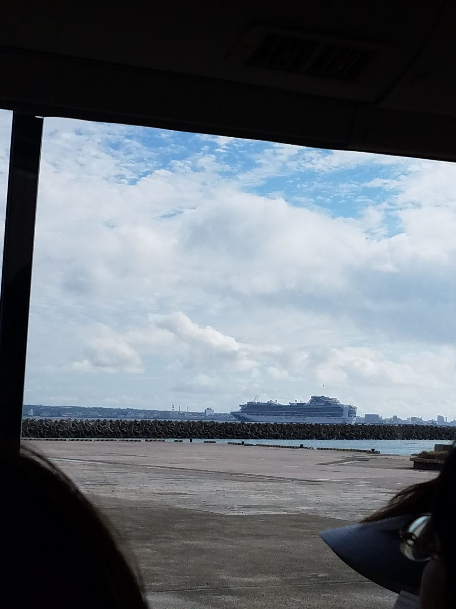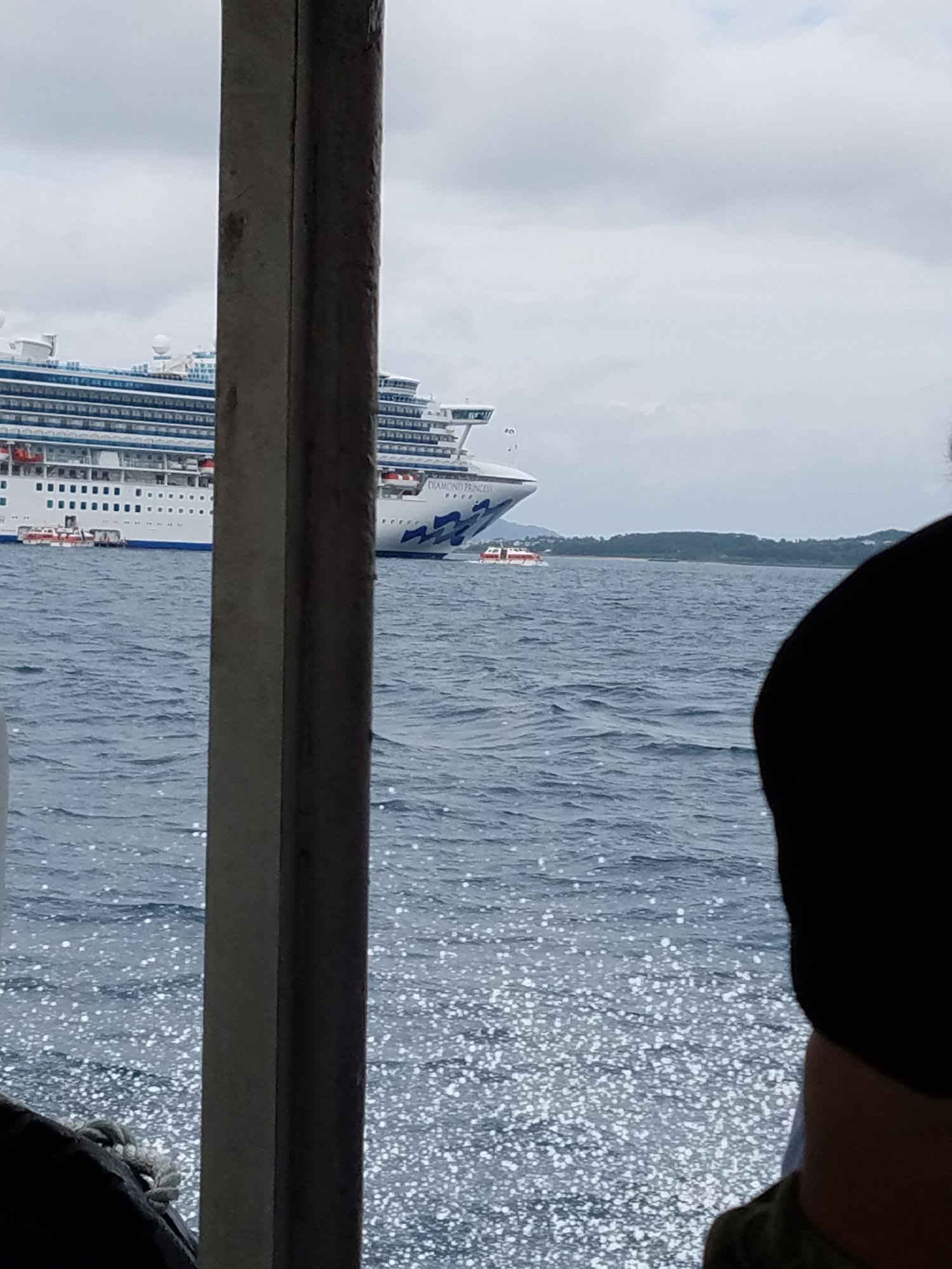 石垣島には クルーズターミナルがあるのですが、海が浅いため、大きな船は入れません。ダイヤモンドプリンセスもちよっとはなれて、錨停泊。