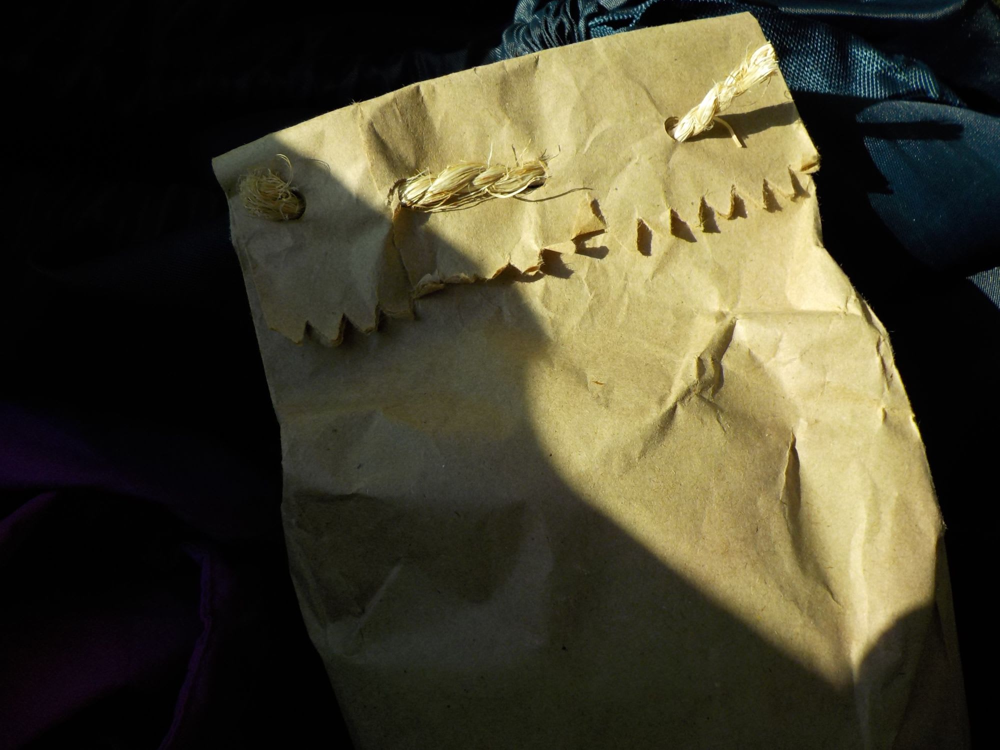 可愛いロープと紙袋に入った、ハムサンドとクッキーとスナックとバナナに、小さいペットボトルの水です。