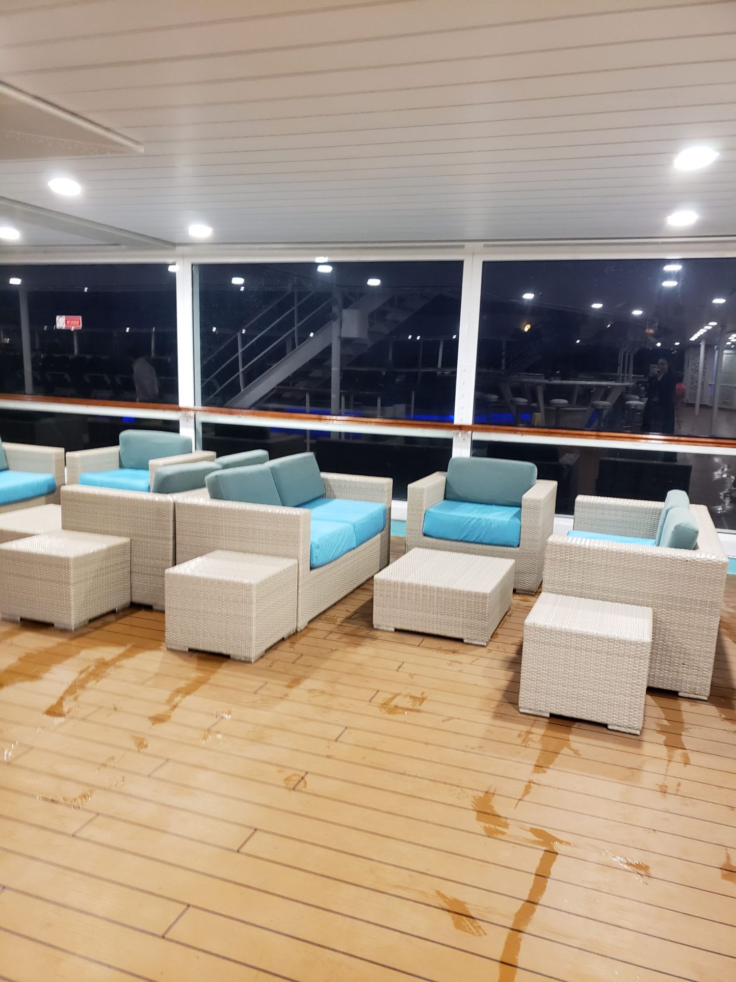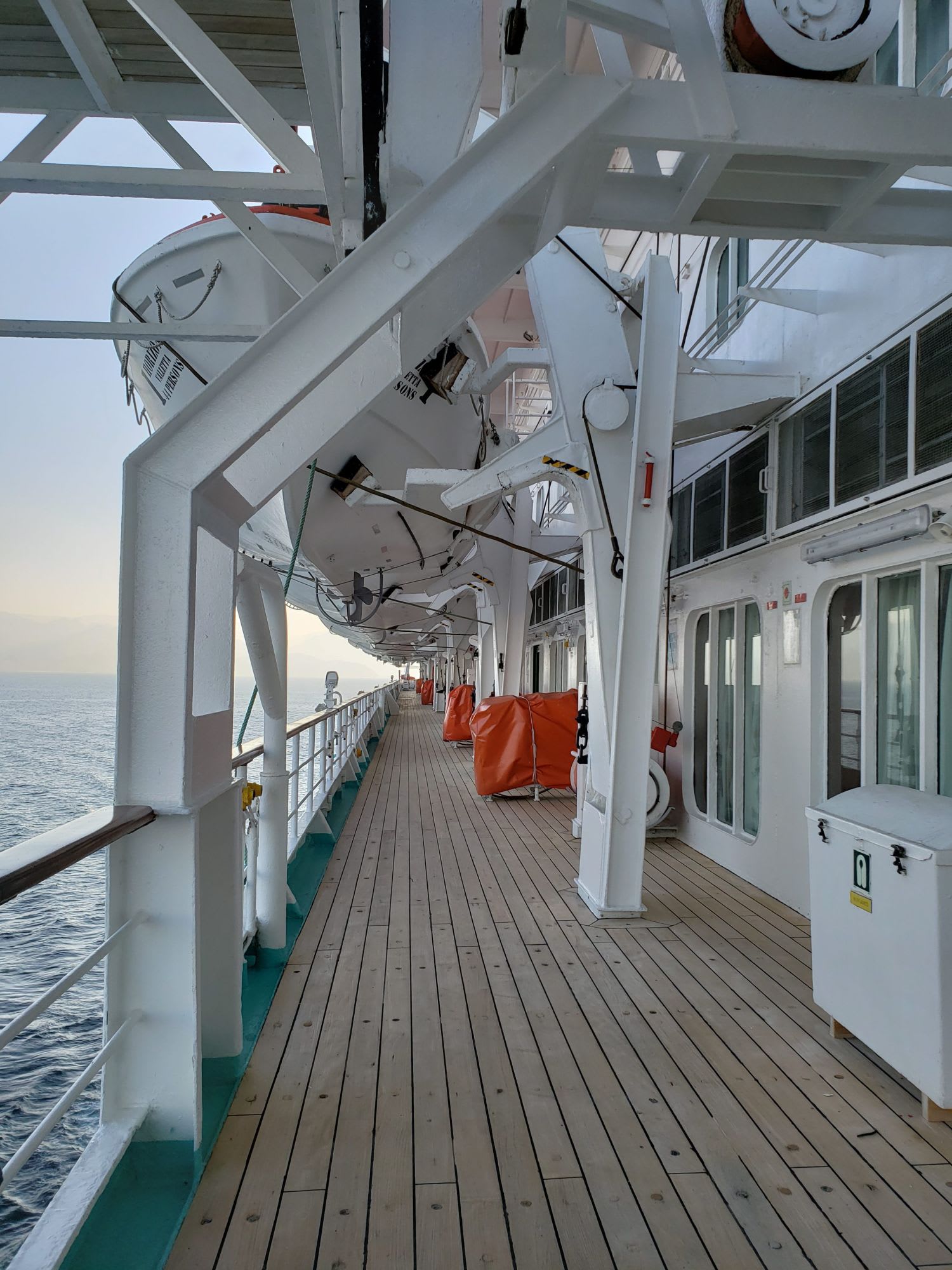 ドアがあちこち重いとか化粧室が古くて設備も整備も行き届かない感じではありますが、歩ける外デッキも感じの良い木製だし、ちょっと前のクルーズらしいクルーズ船を味わえます。