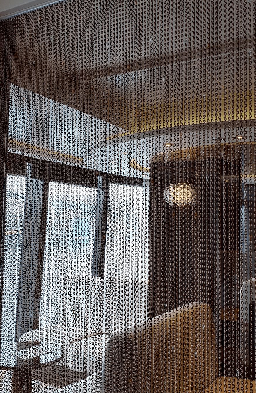 こちらの鎖のカーテンの奥がコジーな空間。居心地も景色もよいコーナー。