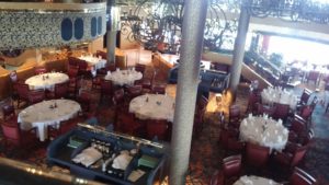 いつもバラの花が短くいけられているテーブルで出されるお食事もアメリカンな感じが強めですがきちんとした料理でテーブルメイトがクルーズ経験豊富な方でシェフを呼んで話をきいたら、ビュッフェもメインダイニングも同じ食材を使っているとのこと。調理が少し違いますが、基本、皆さま同じお食事をという方針と話されていてここも まじめですよね。