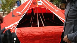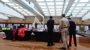 そのほかにもオフィサーの活躍は続き、催しの一つに 救命いかだの説明というのがあって、これがまた面白く、今度は下級の若いオフィサーも大活躍で面白おかしく説明してくださり、最後は救命胴衣を実際に身に着けてプールに飛びこむところまでしてくれて、これは役に立ちますよ。いかだの中の道具などもこと細かくせつめいしてくれましたから。実際のぞいたり、手に取ったりもできました。