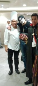 取り立てて、お化けの仮装は持っておりませんでしたが、あるものでお化け化してディナーの席にも行きました。
