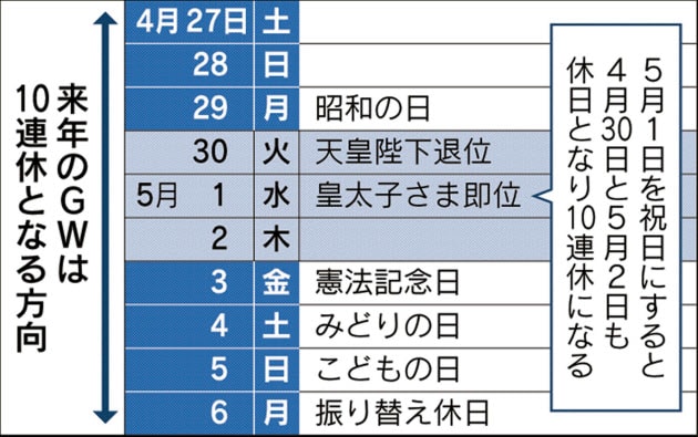 2019年のGWは天皇即位もあり、10連休の期待が持てます。仮に祝日にならなくとも1週間は確実に休めますし、前後の週を絡めて長期休暇が現実的な選択肢となってきます。