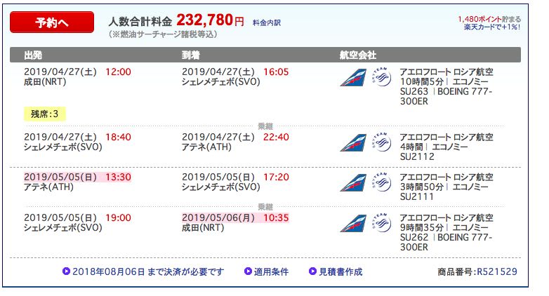 28日乗船の5日下船。ベストのタイミングの1週間です。フライトは幸いなことにAeroflotがアテネに飛んでおり、時間的にも悪くありません。