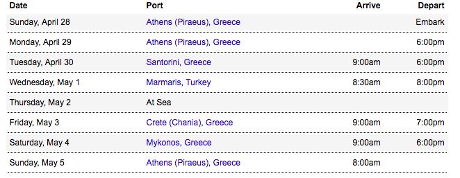 話が再び船にそれましたが、寄港地はエーゲ海ギリシャをゆったりと1週間で回る航路であり、それぞれの港で十分な時間が取れているのが魅力です。また、乗船したピレウス(Piraeus)で一泊停泊しますので、前泊しておけば、アテネ観光は十分可能なため、最終下船をすると直行で帰国できることも今回のItineraryの魅力です。