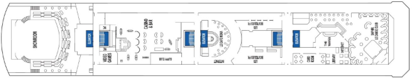 8階はエンターテーメントフロア、前方からシアター、中央カジノ、後方ダンスクラブとなっています。9階は客室ですが、救命ボートのフロア。10階は客室のみ。11階プールフロアで前方が客室の構成です。