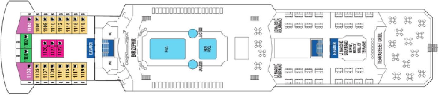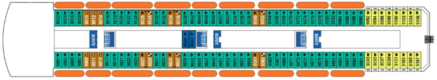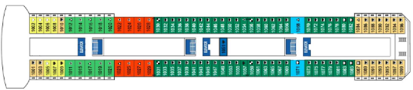 スペイン系ラテンの血が騒ぐ船の8階は夜遅くまでとても賑やかであることはまちがいないでしょう。9階は避けておくべきですね。11階は前方のみ客室ですが、後方のプールデッキ部分が張り出しているので後方視界はどうでしょうか。前方はブジッジですので、前方視界も少し疑問。10階がベストだと思います。前方は5室がバルコニー付き、6室目からはスイートです。やはり視界が良いのは6室目から後方なのでしょうね。だとしたら、最後方が良いのかなと思います。