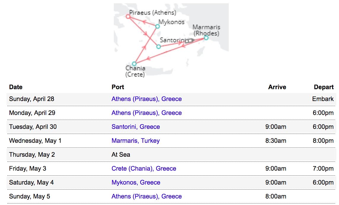 結論から言うと、Pullmantur Horizon (Atens ~ Santorini ~ Mykonos ~ Athens)のクルーズ + Aeroflotモスクワ経由フライト (4月27日往路、5月5〜6日帰路、うち27日乗船、5日下船)を選択しました。