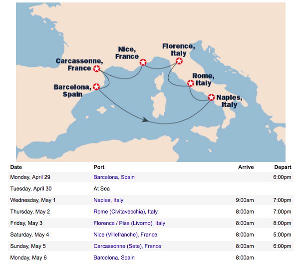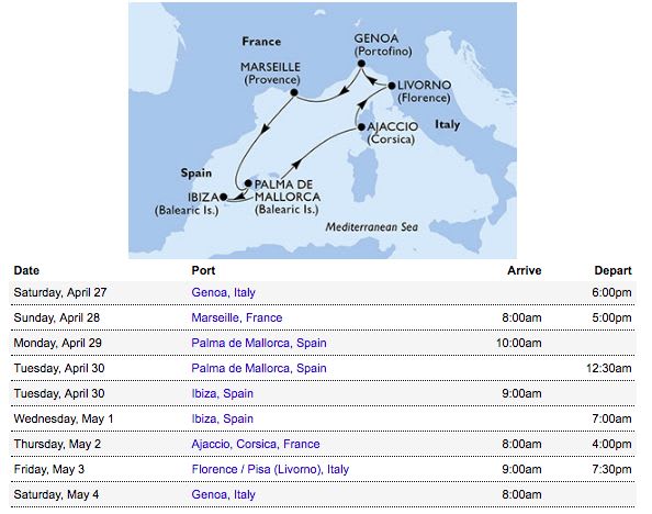 今回の上記6コース。実はそれに2コースを追加して相談しました。追加した2コースは、以下の「西地中海のイタリア・フランス海岸巡り」と「西地中海の島巡り」です。
