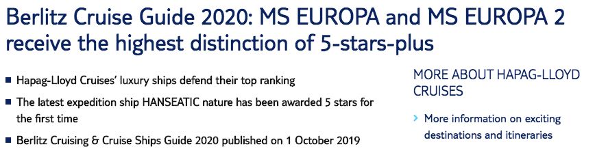 Berlitzのクルーズガイドは欧米でクルーズ船を紹介するガイドブックだが、複数年にわたってHapag-Lloydが小型船部門のトップを取っている。Silverseaを完全傘下に収め、Hapag-Lloydにも資本参加。TUI CruiseはMein Schiffシリーズ船で、これもまた大型船部門で上位に並ぶ。カジュアルラインが強かったRCLがコロナ禍以降、高級ラインでも存在感を増していくことが考えられる。