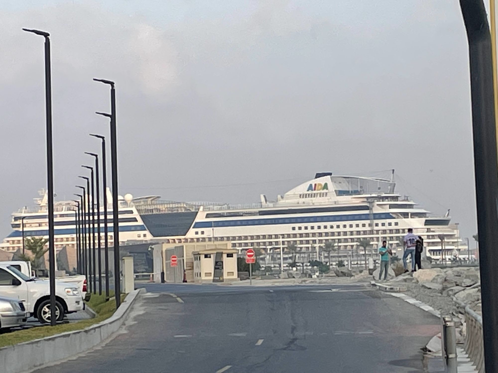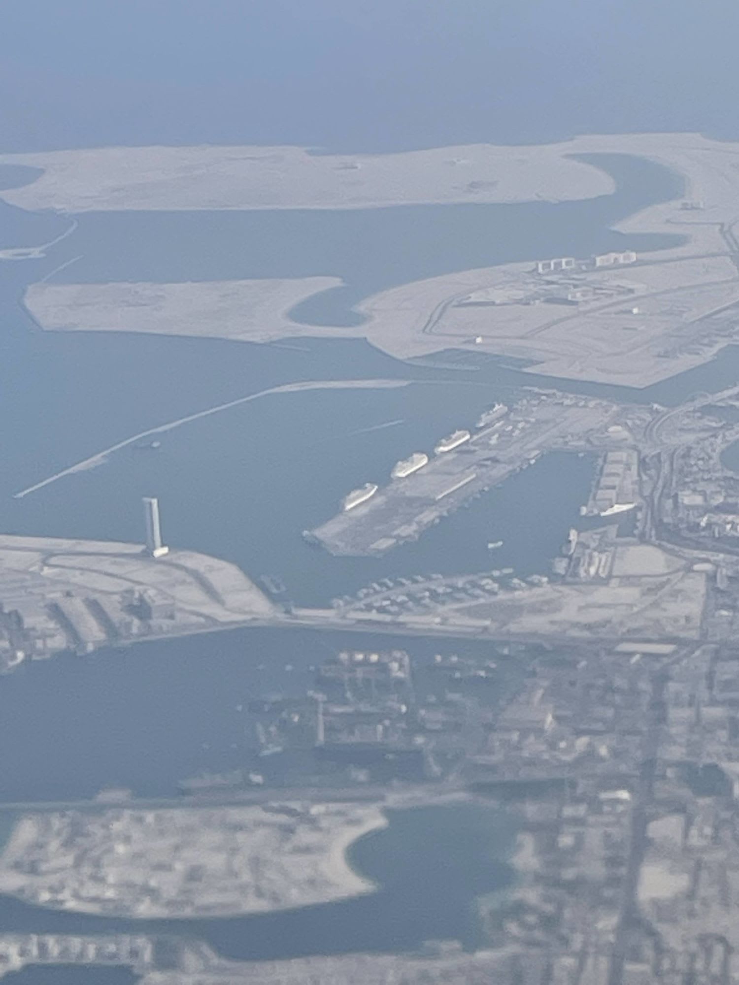 Bahrainは初入国になります。Dubaiからの短時間フライトですが、離陸直後に港の上空を通過する際に、写真を撮りました。冬の中東クルーズは最近のトレンドですが、まだ運行再開には成っておらず、4隻が停泊していました。11月21日です。
