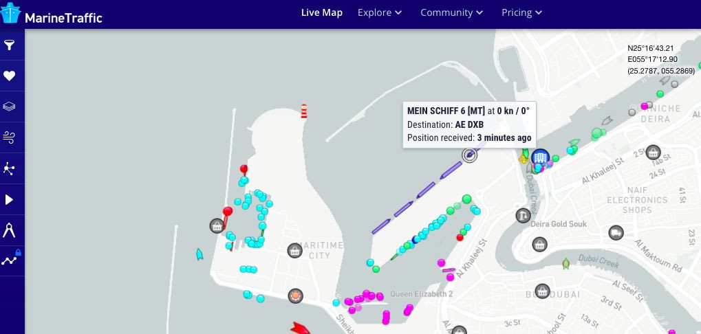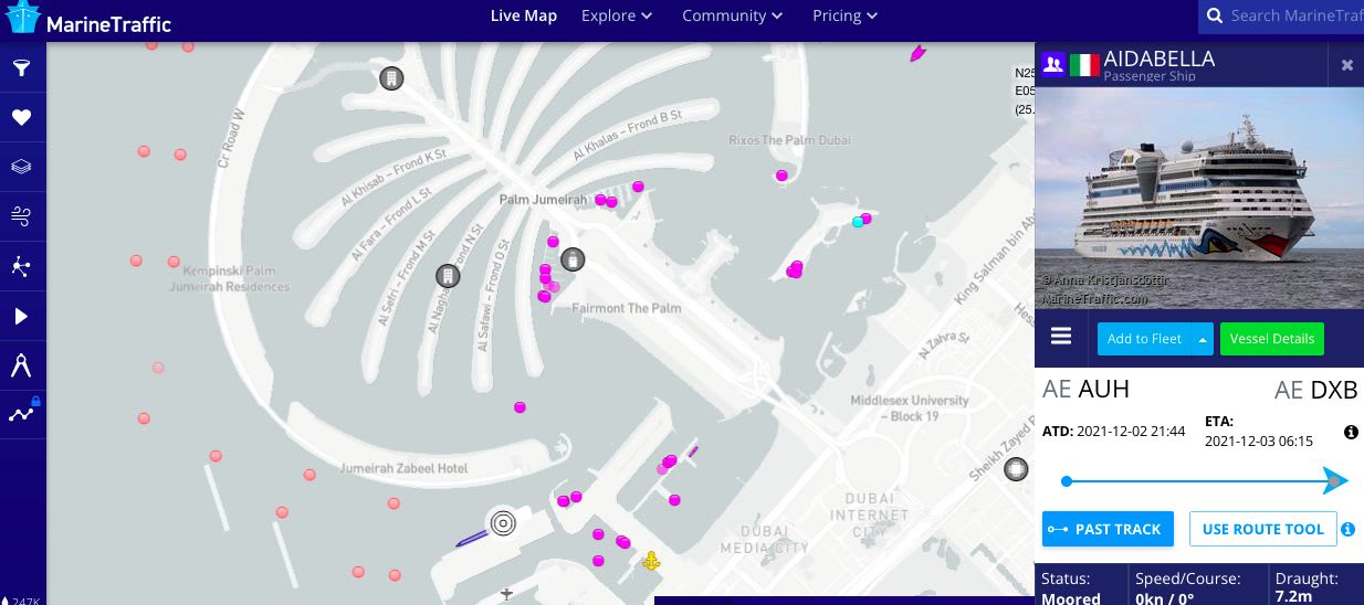 帰国してMarine Trafficで船名を調べてみたら、停泊が5隻になっていました。(12月4日)写真右から、Mein Schiff 6, MSC Virtusa, Costa Mediterranea, Norweigian Jadeの4隻に加えて、Costa Serenaが入ったようです。