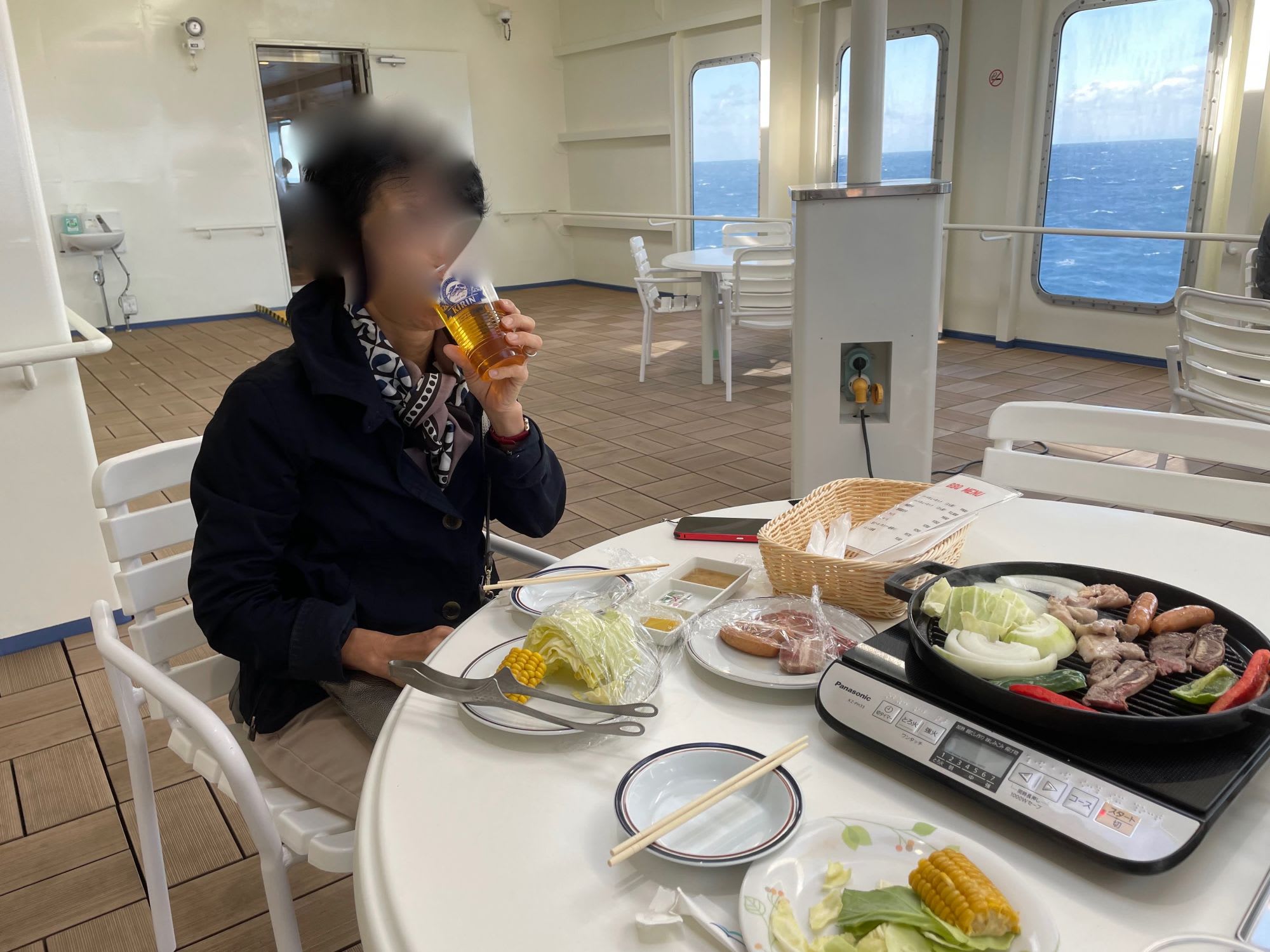 また、ここでも特筆すべきは、専用デッキでのBBQ。単にIHコンロで野菜と肉を焼くだけの鉄板焼きですが、洋上で食べるBBQとビールは最高です。運転のためビールの提供は2時までとなっていますのでランチのみですが楽しめました。