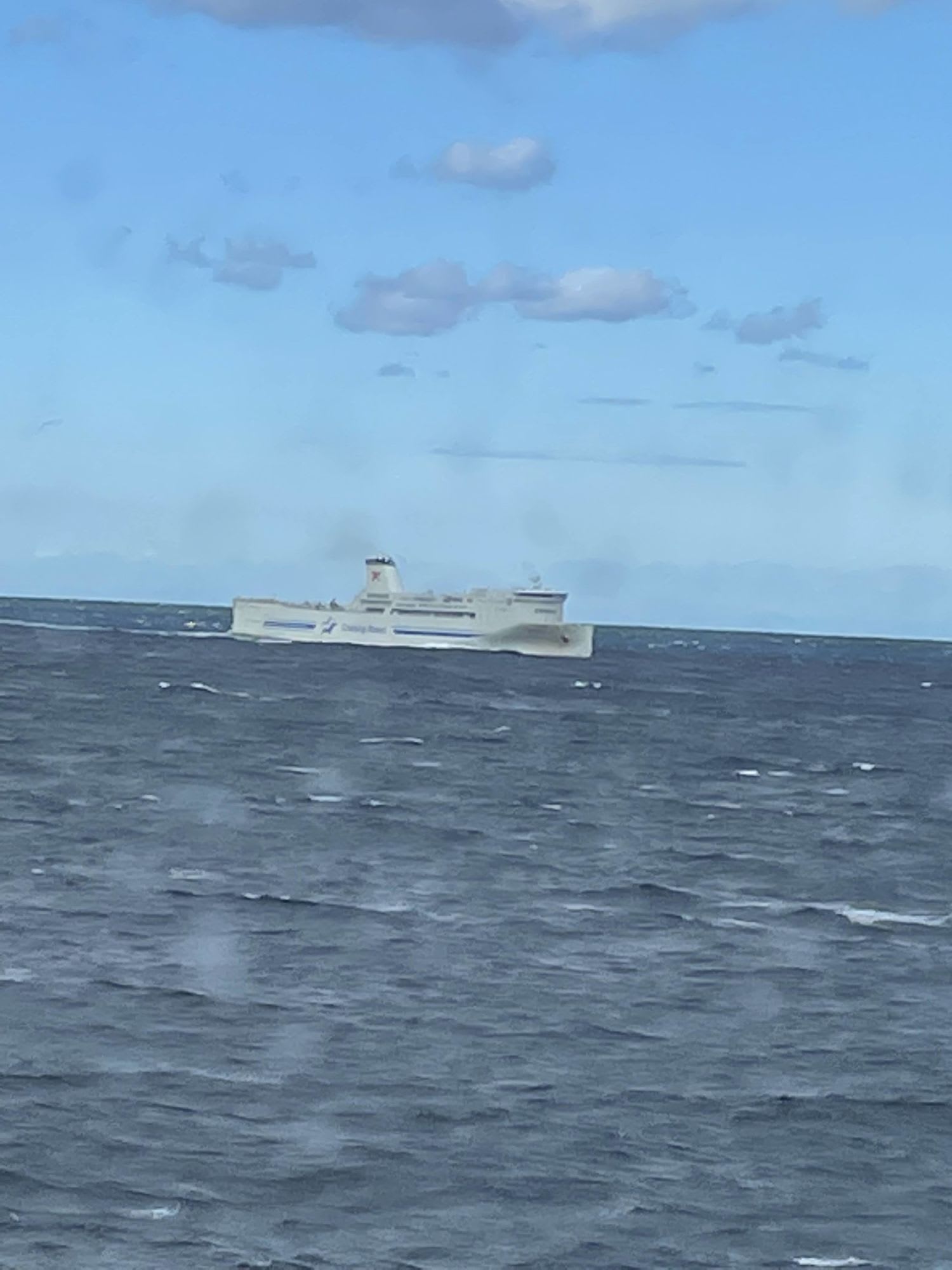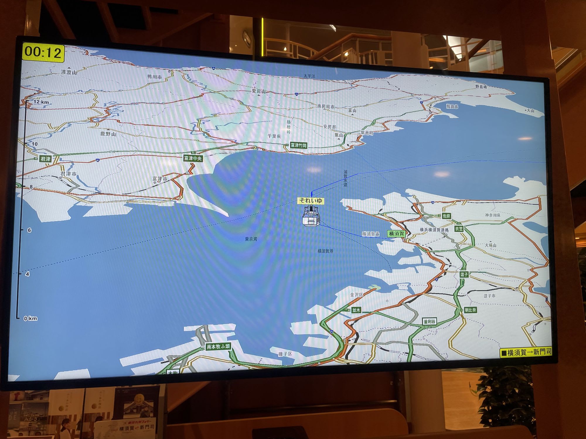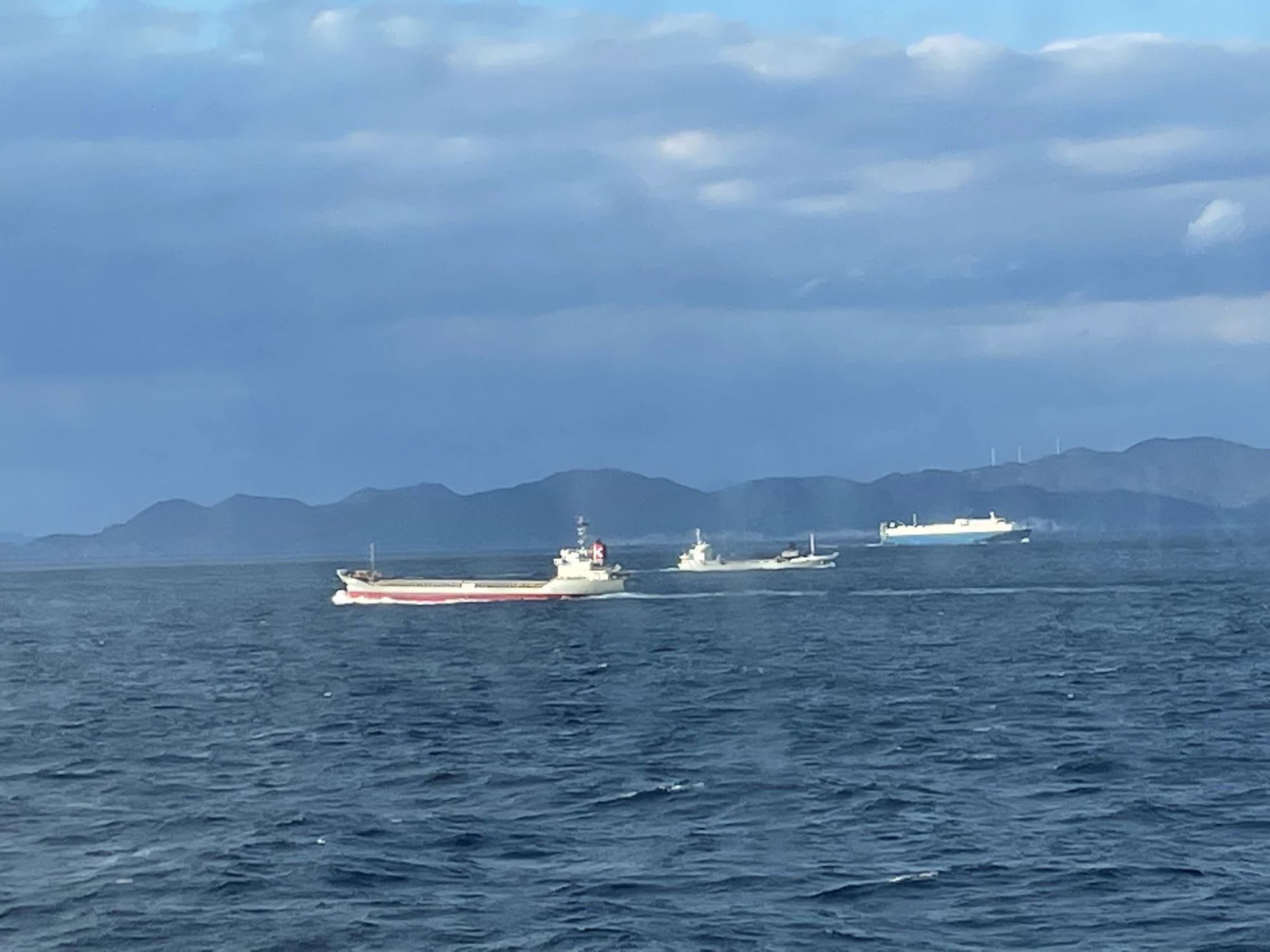夜間は多少波があったのかもしれませんが、程よい振動の中で熟睡。翌朝は午前中波高が1~2mから、午後に2〜3m程度になる、平穏な航海。その中を28ノットで走ります。ちょうど正午から午後に紀伊半島の潮岬沖を通過し、紀伊水道沖で姉妹船の「はまゆう」とすれ違いました。