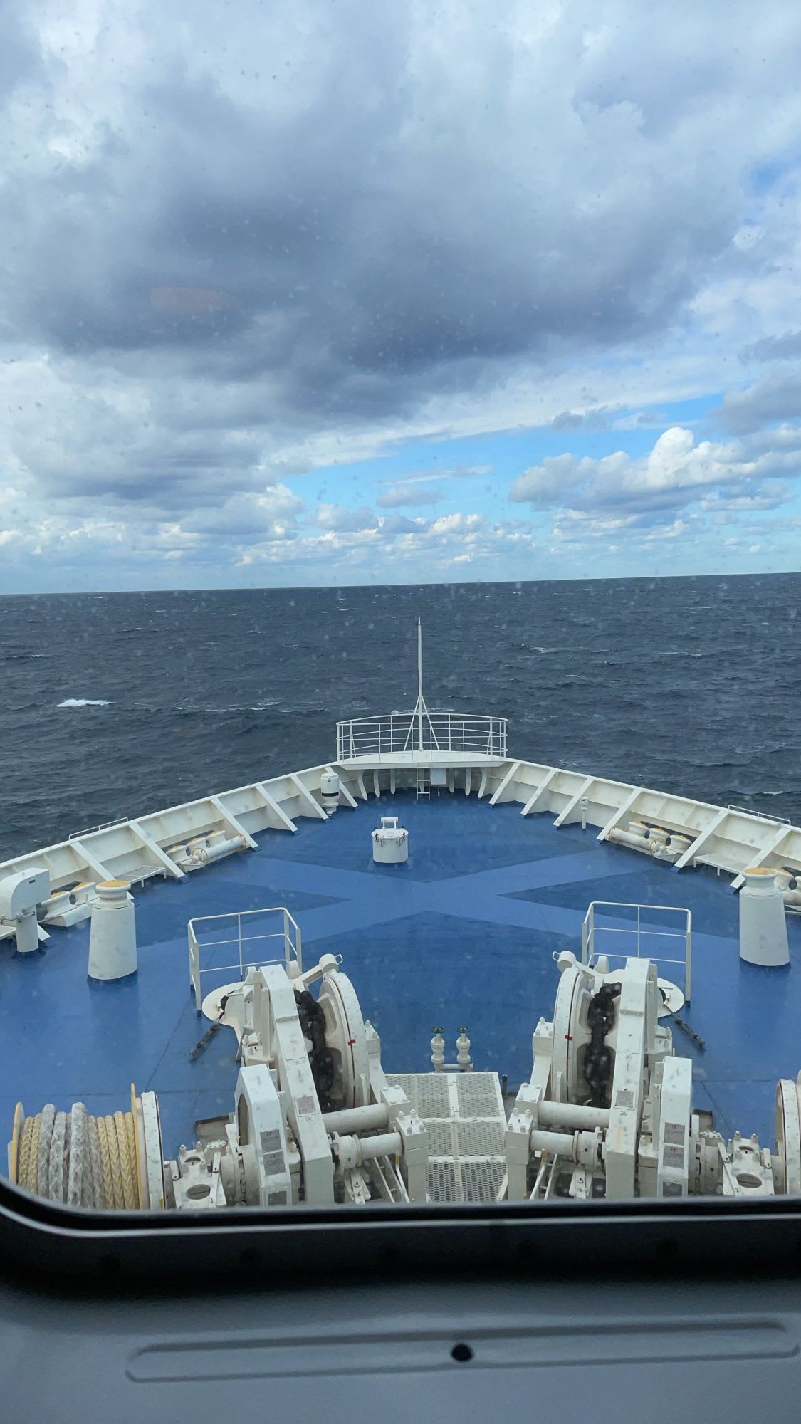 紀伊水道を超えた室戸岬沖から多少白波が出てきたので、先端のサロンで舳先(Bow)を見ながら揺れないか期待しましたが、速度の割には波を切る能力が高くほとんど揺れません。