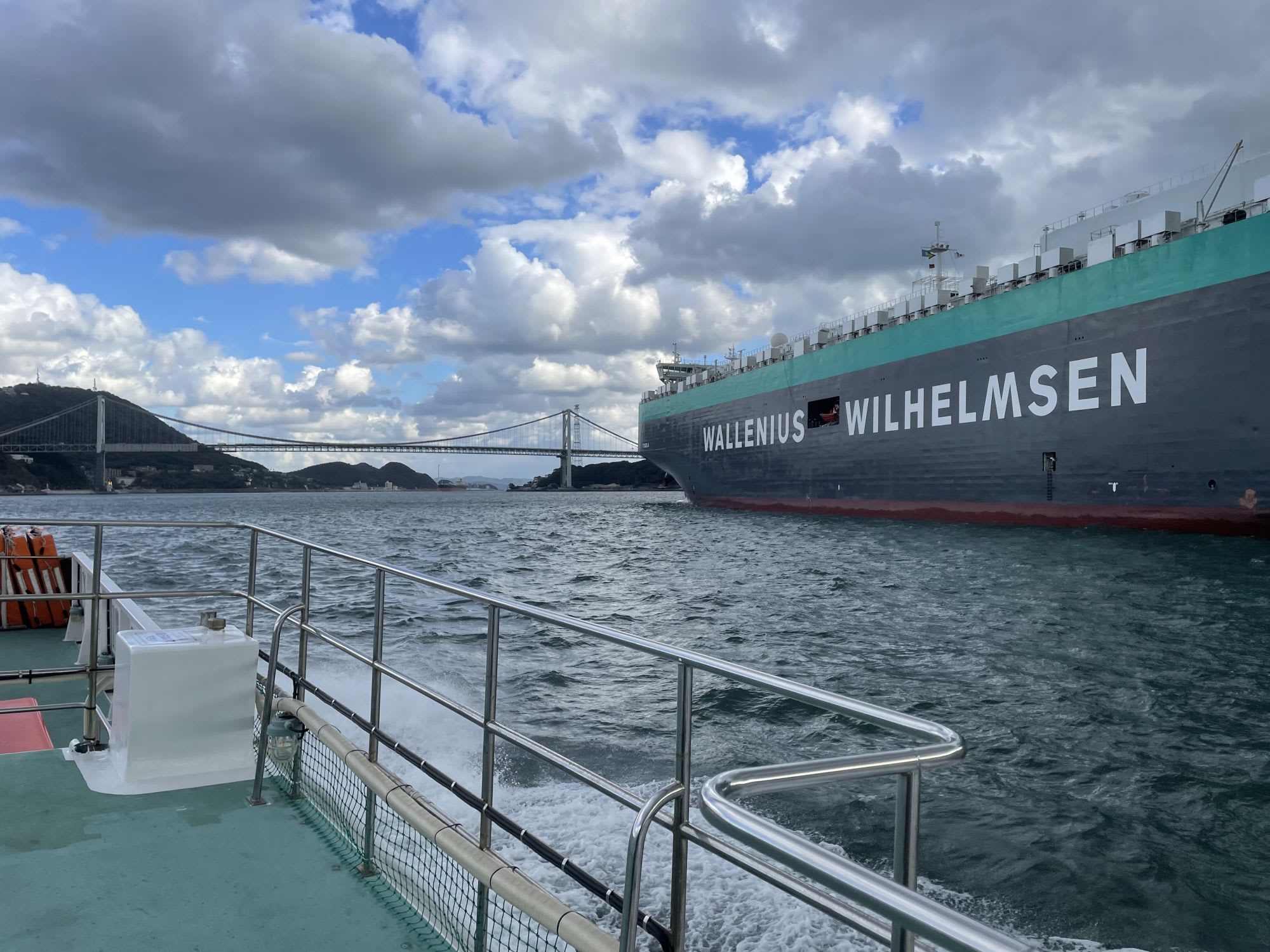早朝散策を済ませて、渡船で下関へ、関門海峡は本船が行き交う交通の要所。目の前をWalleniusの大型自動車専用船。九州トヨタの車をヨーロッパに運ぶのでしょうか。Walleniusの船は、久しぶりに見ました。