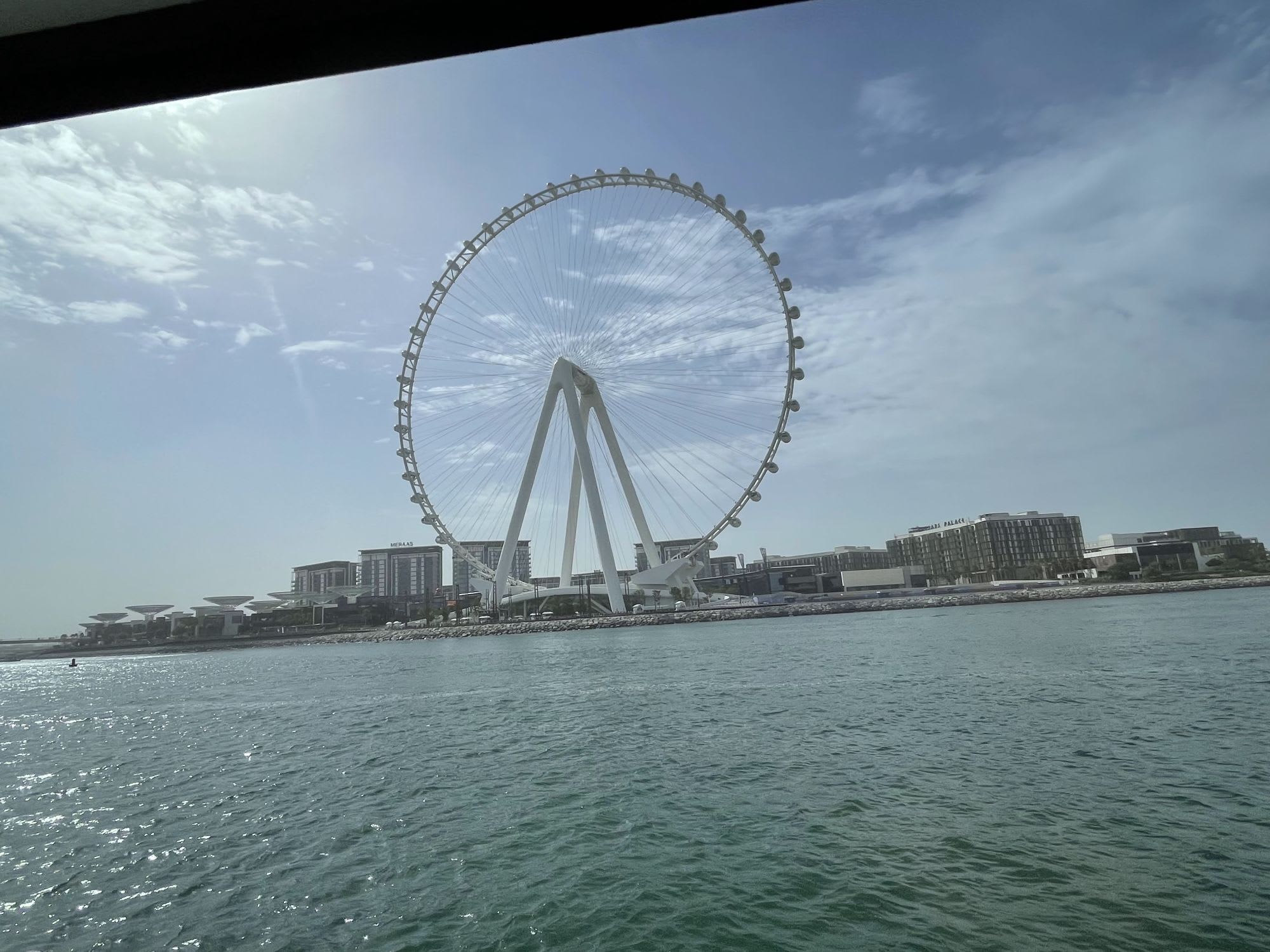 Ferryはマリーナの運河を出ると、ジュメーラービーチの横を通ります。シンボルマークとなっている観覧車が左舷側、ドバイハーバーが右舷側です。