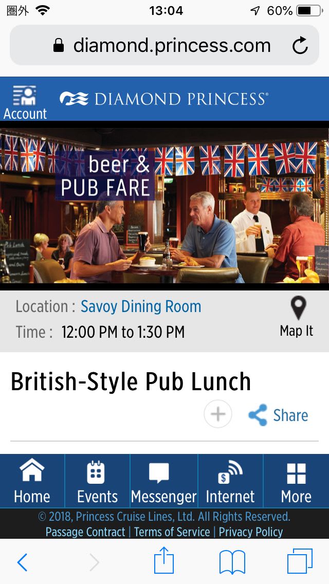 - 3時 お知り合いになった、Hさんご夫婦との歓談。Hさんはクルーズの大ベテランで、Princessに4航海連続で乗られたこともあり、この航路も2回目とのこと。プラチナクラスでいろいろな特典を持っておられ、話が弾みおしゃべりを続けていたら、夕食の準備時間になり追い出される。