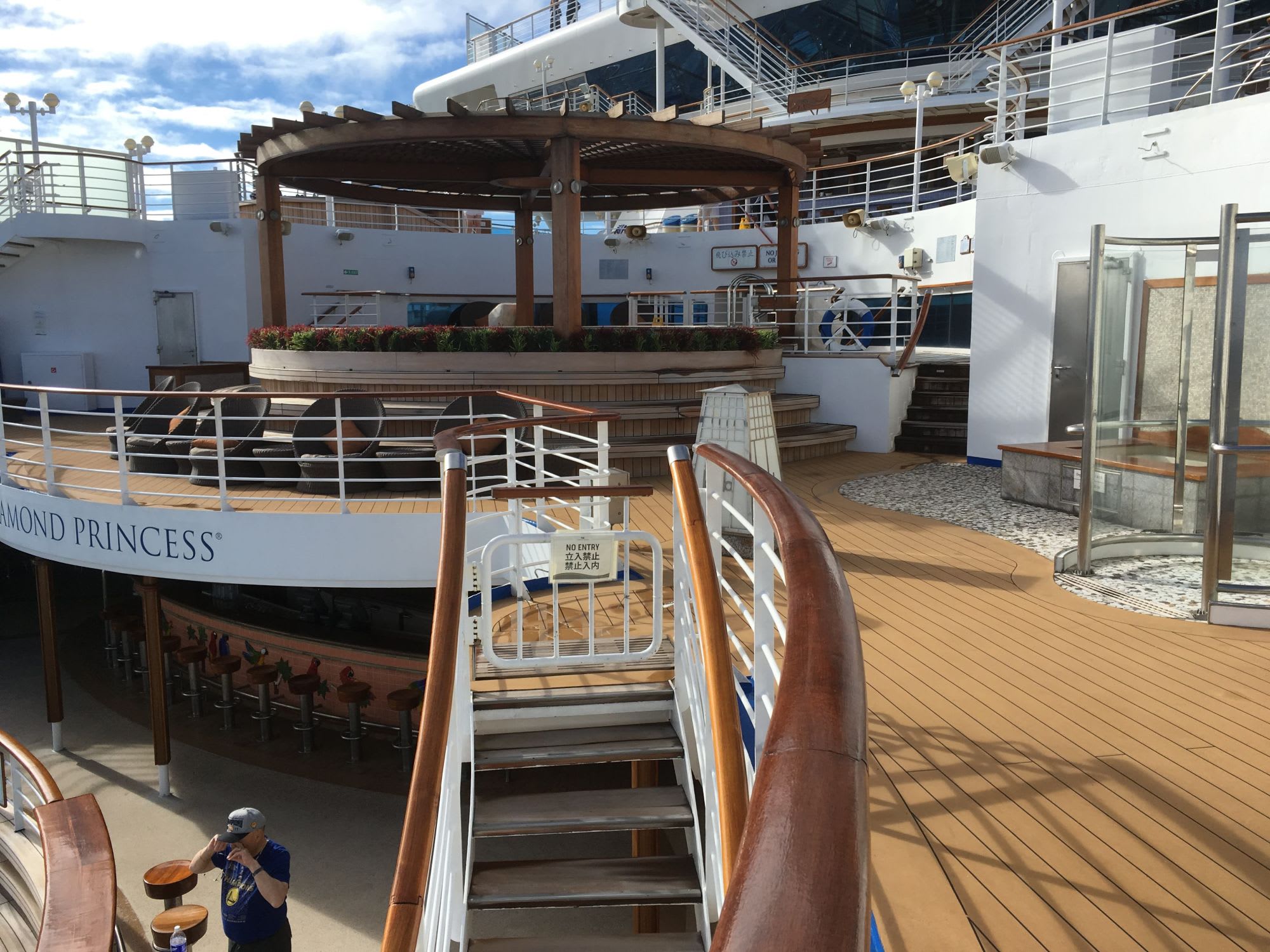 - 7時30分 写真と宝石店のラッフルに家内と別れてそれぞれ参加。残念ながら外れました。今夜のショーは8時45分からなので、期待していた運動のためウォーキングルートを2マイルは歩こうと家内は着替えに部屋に戻り準備をしていたら、急に海が荒れ始め、ウォーキングデッキが閉鎖になってしまいました。