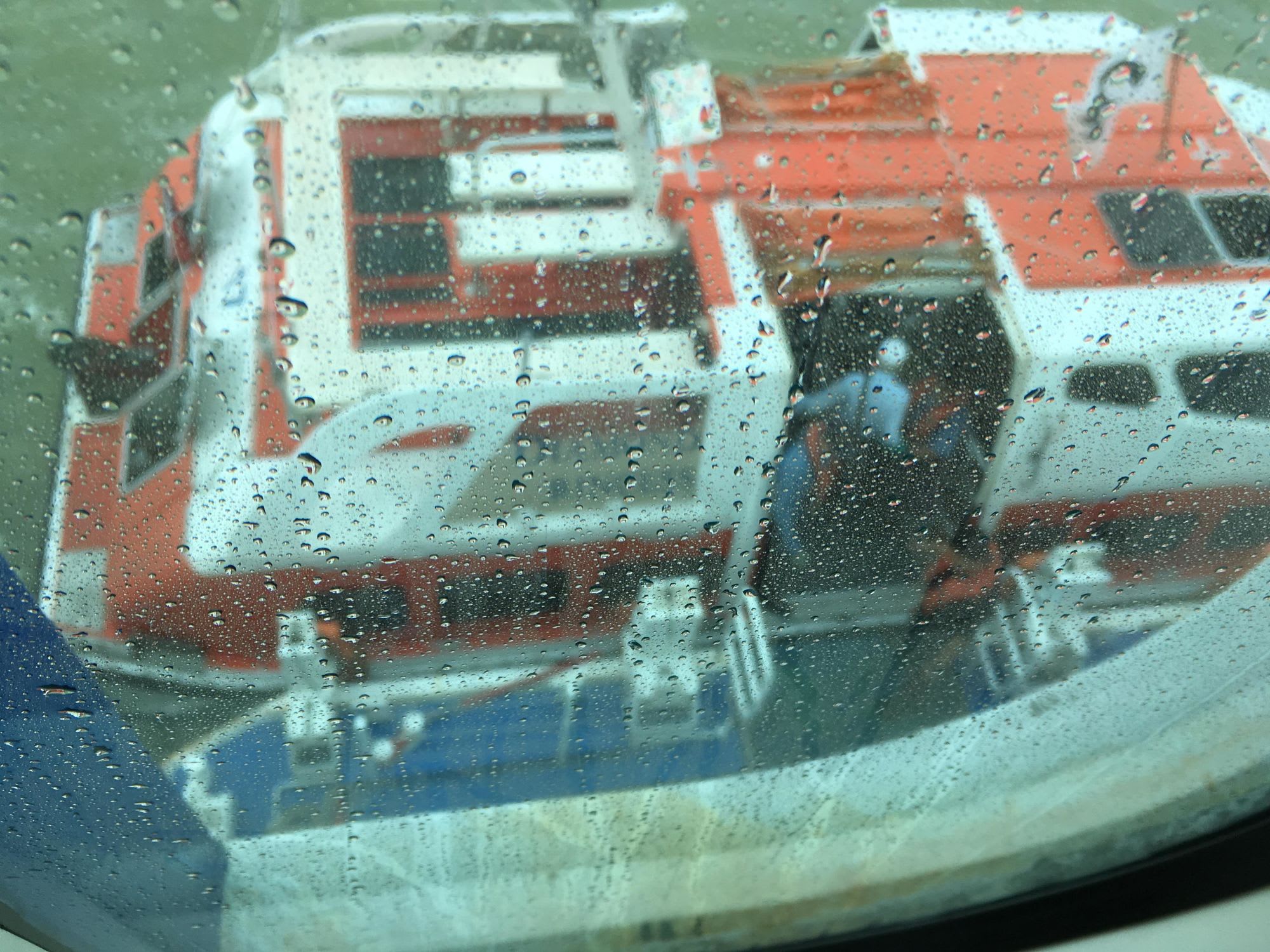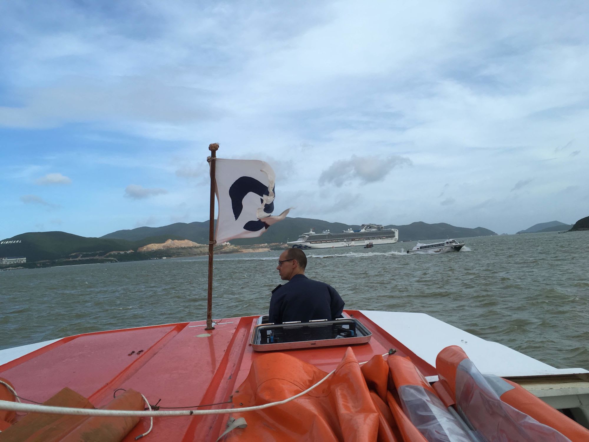 今回のクルーズで初めて、かつ唯一のテンダー上陸です。乗客は年配者が多いので、今日の揺れでも乗移りは大変だろうなと思っていましたが、やはりその通り。大変そうです。