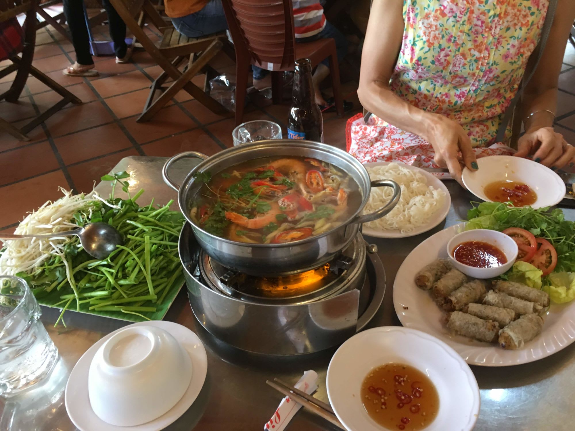 春巻きも火鍋も本格ベトナム料理という感じでパクチーはたっぷり。唐辛子たっぷり。空芯菜たっぷり。加えて竹の細いような筋のある茎もたっぷり。辛いけどやめられない。最後の締めは米麺で、とってもヘルシーなお料理でした。お店の店主はやり手のおばさん。店の真ん中にどんと座って、お茶を飲みながら、若い店員にテキパキと指示を出していました。みんなテキパキと仕事をしており、好感度は高いです。料理の味もよく、一気にNha Trangの株が上がりました。最後店を出るときに女店主にありがとうと言って別れ、シャトルにて船に戻りました。