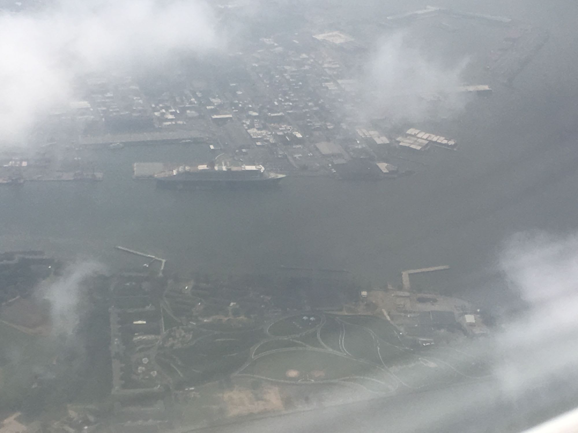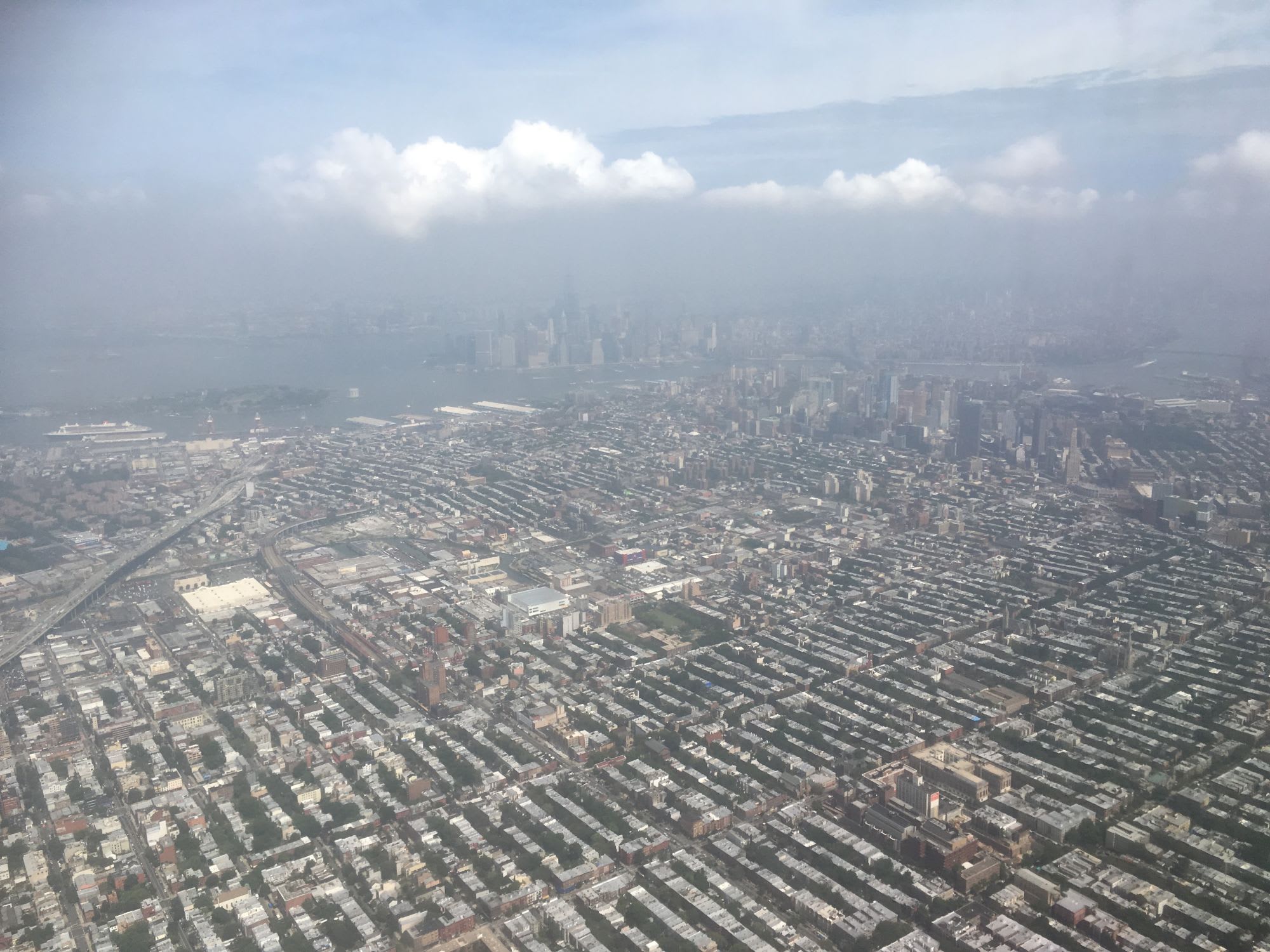 ボストンからニューヨークへのシャトルフライト。正面のマンハッタン。手前左側にブルックリンのクルーズ船ターミナルを見つけた。大型の客船が留まっている。まだ、船型から船名が特定できない。