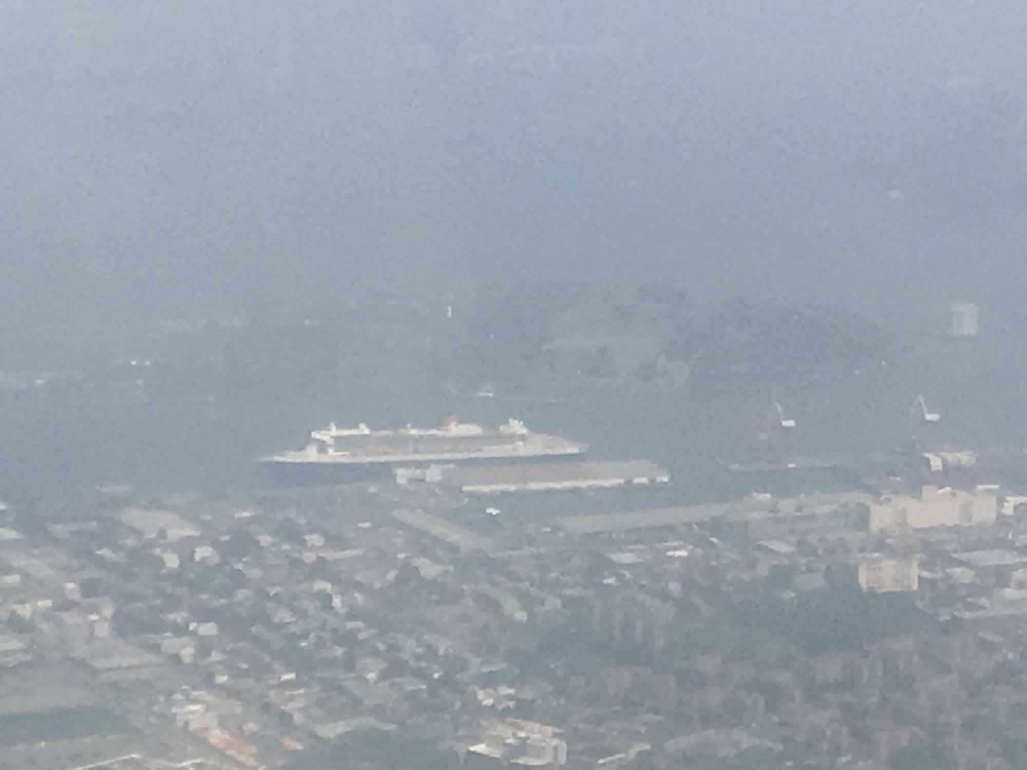 さらにもう一度旋回。飛行機はブルックリン上空を北に機種を向けて、ラガーディア空港へのファイナルアプローチ。カメラをズームで赤いファンネル確認。大きさと形からしてQueen Maryであることは間違いなし。