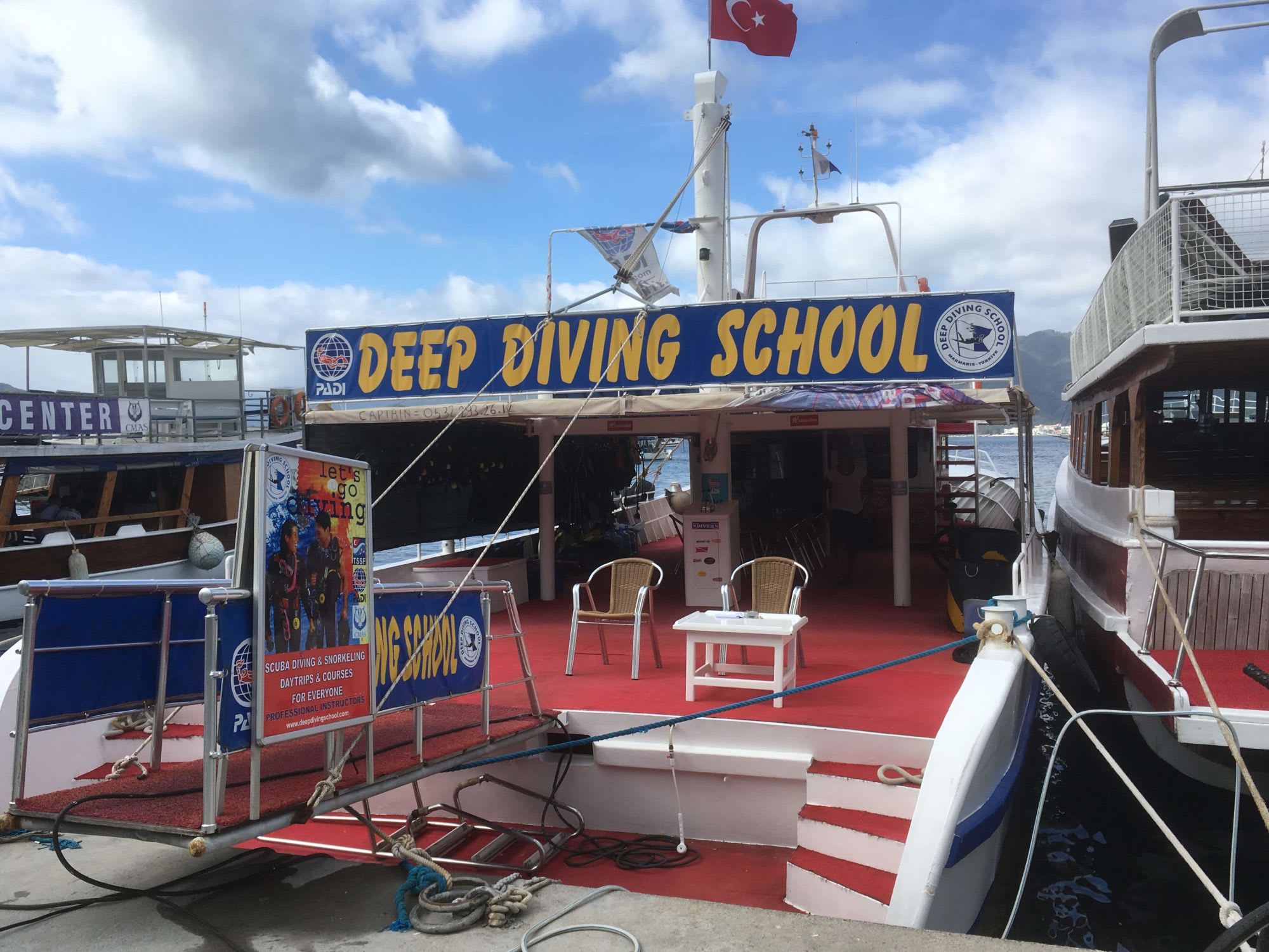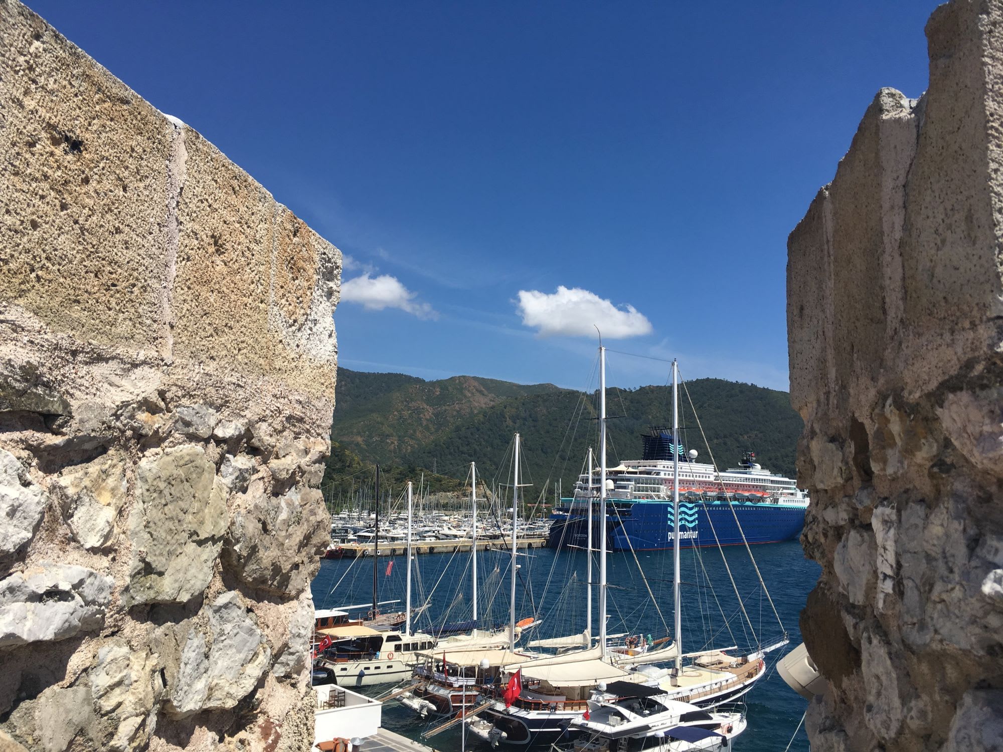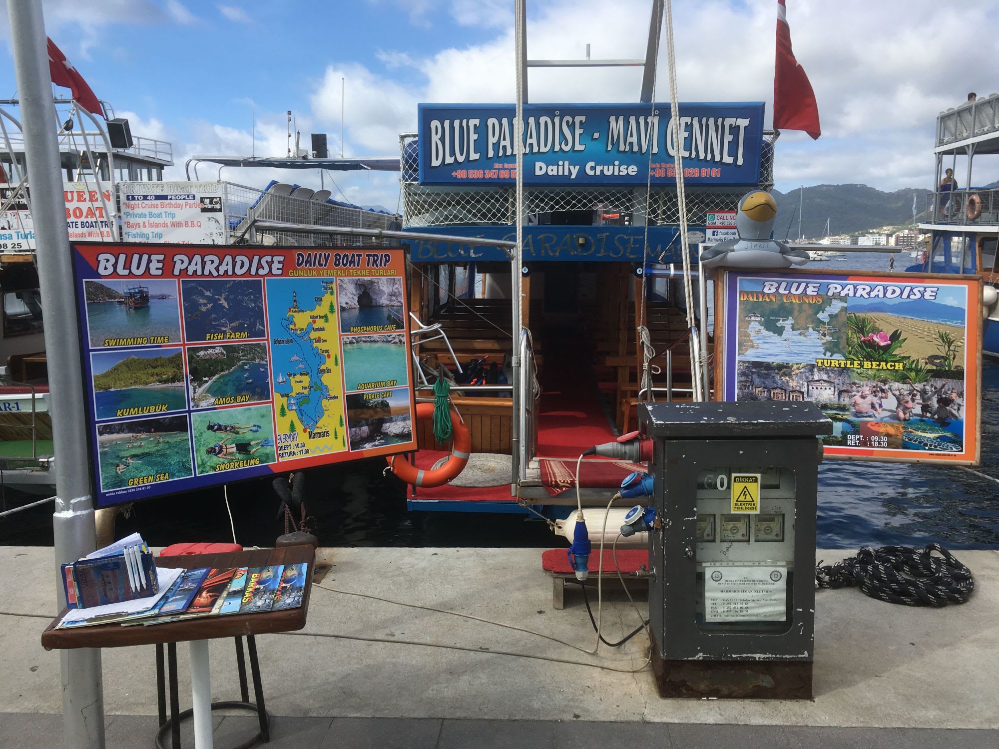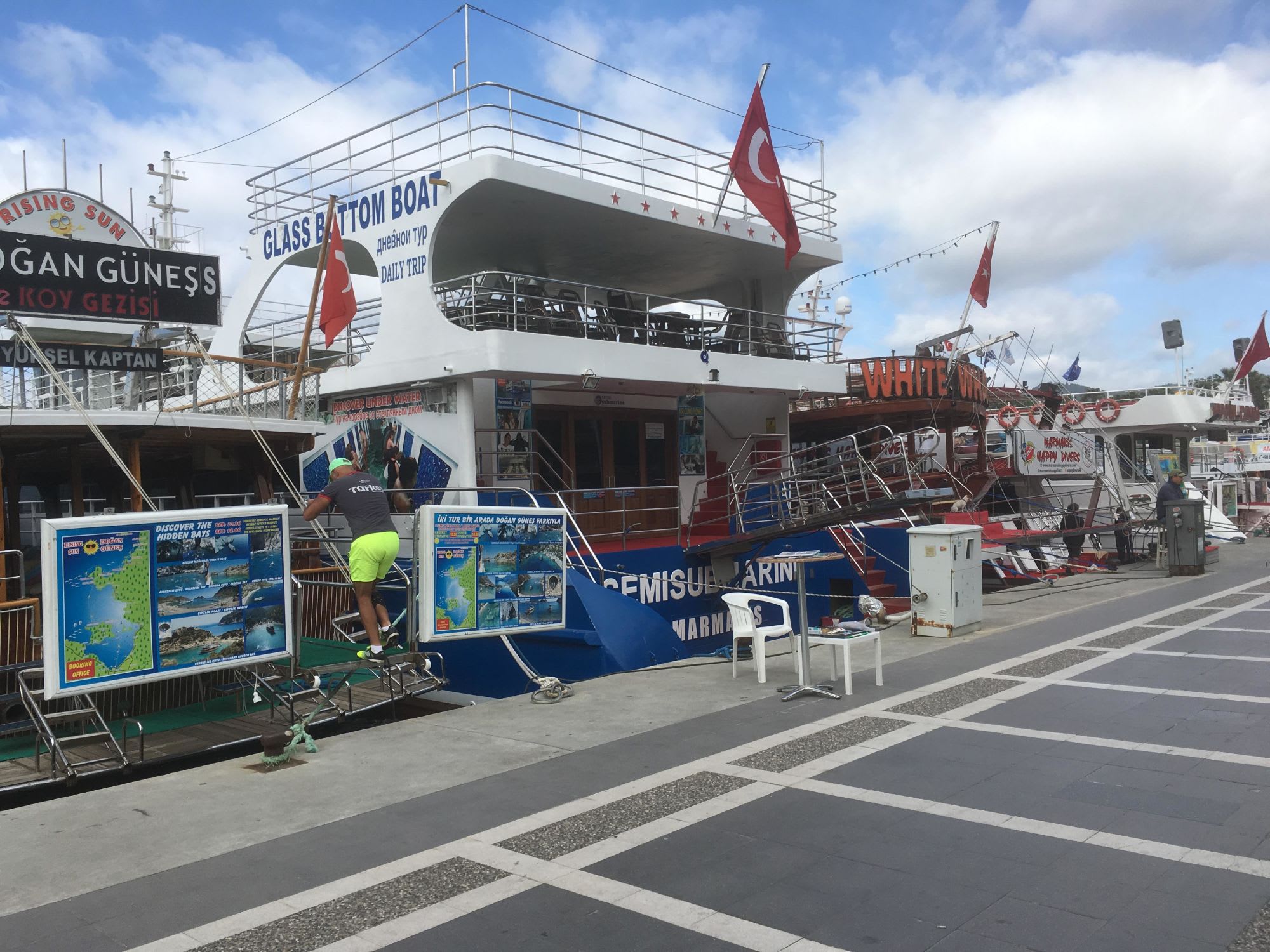 マリーナを抜けると、岸壁には観光遊覧船が、陸側にはレストランが続き、レストランの裏にはマルマリス城とバザールが広がります。観光船は1日島巡りや、ビーチ行き、ダイビングなどいろいろあります。