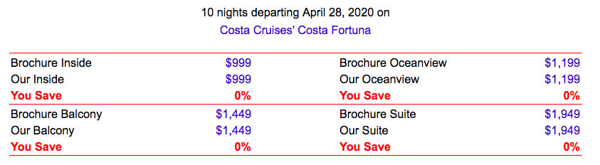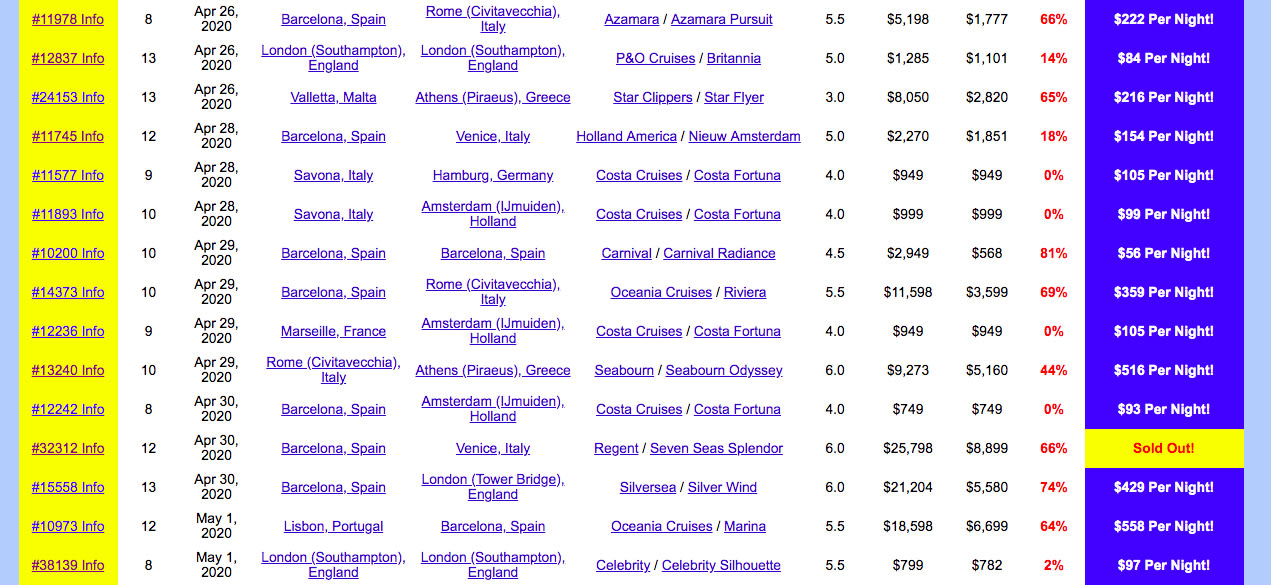 私は今年のギリシャ島巡りがよかったので、次はカナリヤ諸島を狙っていましたが、カナリヤ諸島はGWではなくお正月の方が良さそうです。そうなると、やはり地中海で、8〜13日ぐらいで少し長いコースを考えてみました。日程内に帰るには、5月1日の8泊9日までが限度でしょうか。26日から1日の範囲で探しました。同じくVTGです。表の金額はINSIDEの部屋ですが、実際に選ぶのは個別の価格を調べます。