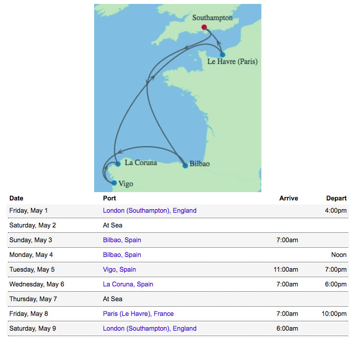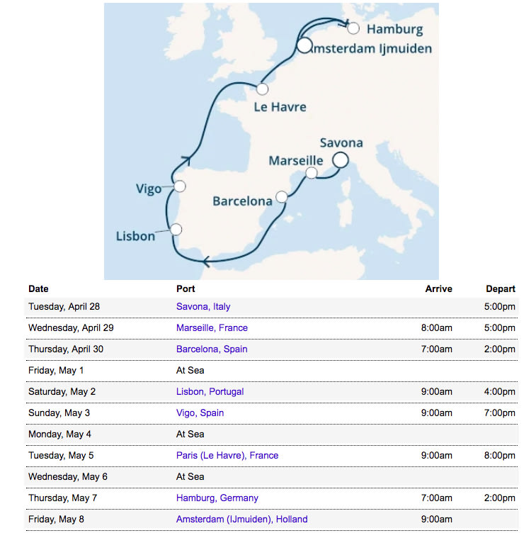 このコース、何度行っても新しい発見があると思います。したがって、決める要因となるのは日程と寄港地。オーソドックスな7泊8日であれば、4月26日から5月2日までの出発で日程的には収まります。VTGで見ると、本当にたくさんありますので、寄港地と出発地点で選んでください。フライトの利便性と価格を考えて選べば良いでしょう。私は最近使ったキャリアは、トルコ、エミレーツ、Air China、アエロフロート、キャセイですが、エミレーツの引き返し以外は、遅延もなく満足いくものでした。機体も新しく、サービスもアメリカ航空会社に比べると良いです。中東経由は、夜行便、欧州・アジア系は昼便ですので、どこから乗船するかで選べば良いと思います。せっかくですから、時間の許す限り前後泊を入れたいと考えると、東から考えて、アテネ、ベニス、ローマ、ジェノバ、モナコ・ニース・マルセイユ(パリから電車またはフライト)、バルセロナとサザンプトン(ロンドンから電車またはバス)などから出るのが良いと感じます。