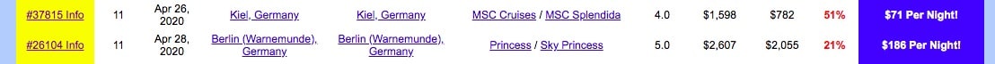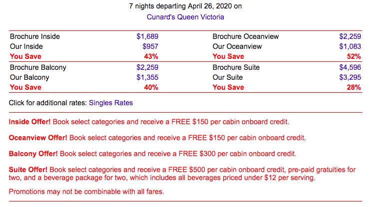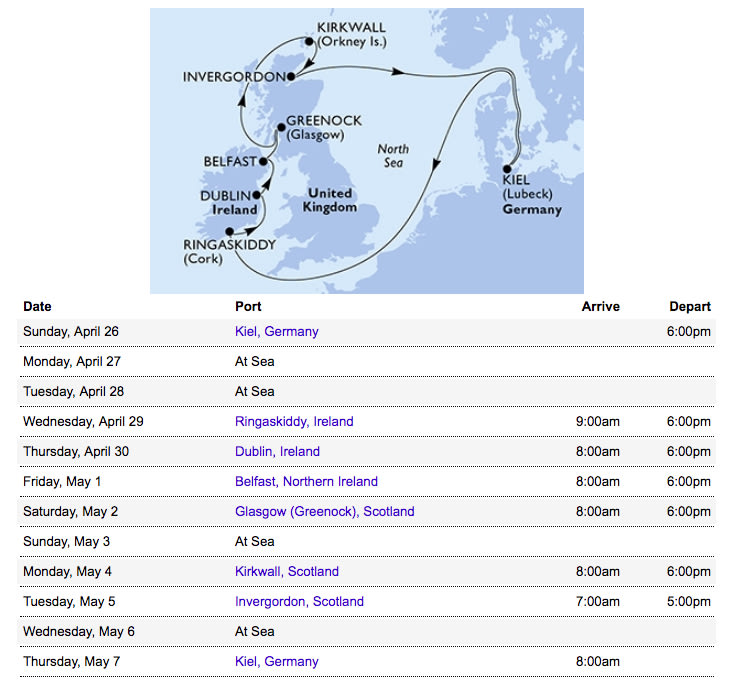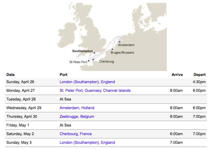 参考までに、行程と金額を入れておきます。両方とも良く纏まっていると思います。欧州で地中海以外を散策したい方にはぴったりかもしれません。たまたまですが、Queen Victoriaはキャンペーンをやっていました。