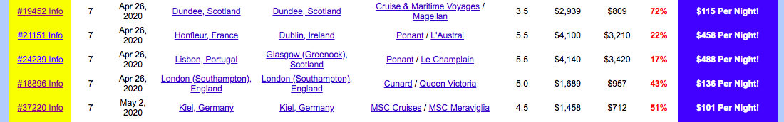 この中で選ぶなら、MSCのSplendidaで行くIreland/Scottlandか、Cunard Queen VictoriaでいくFrance, Belgium, Netherlandですが、両船とも乗船したことのある船で、Queen Victoriaはほぼ同じコースなので、対象から外すことにしました。