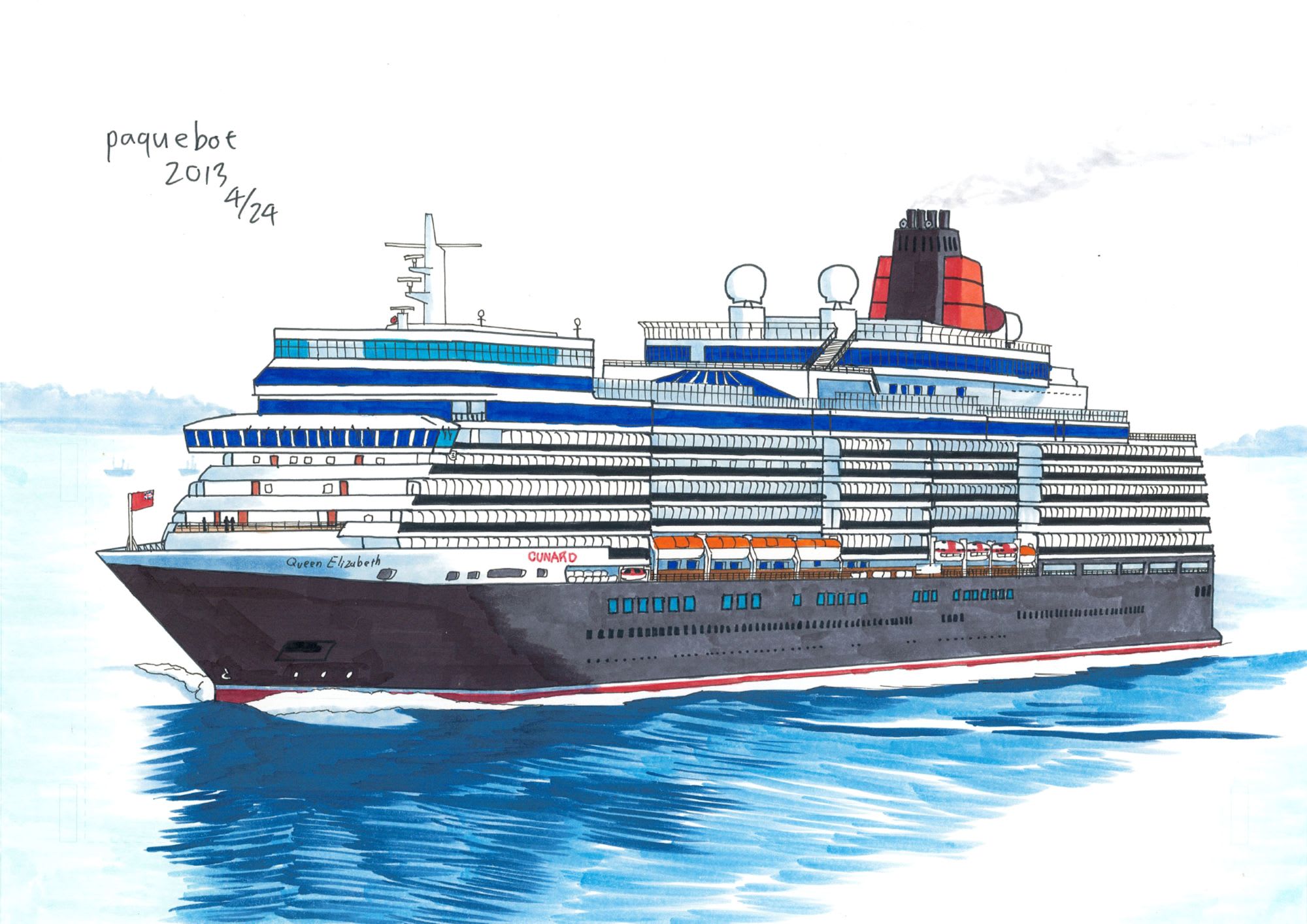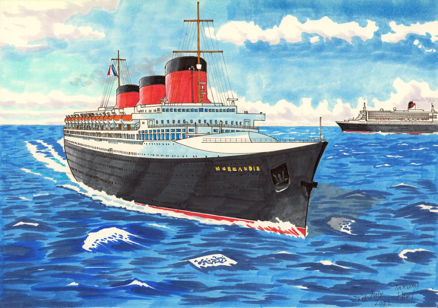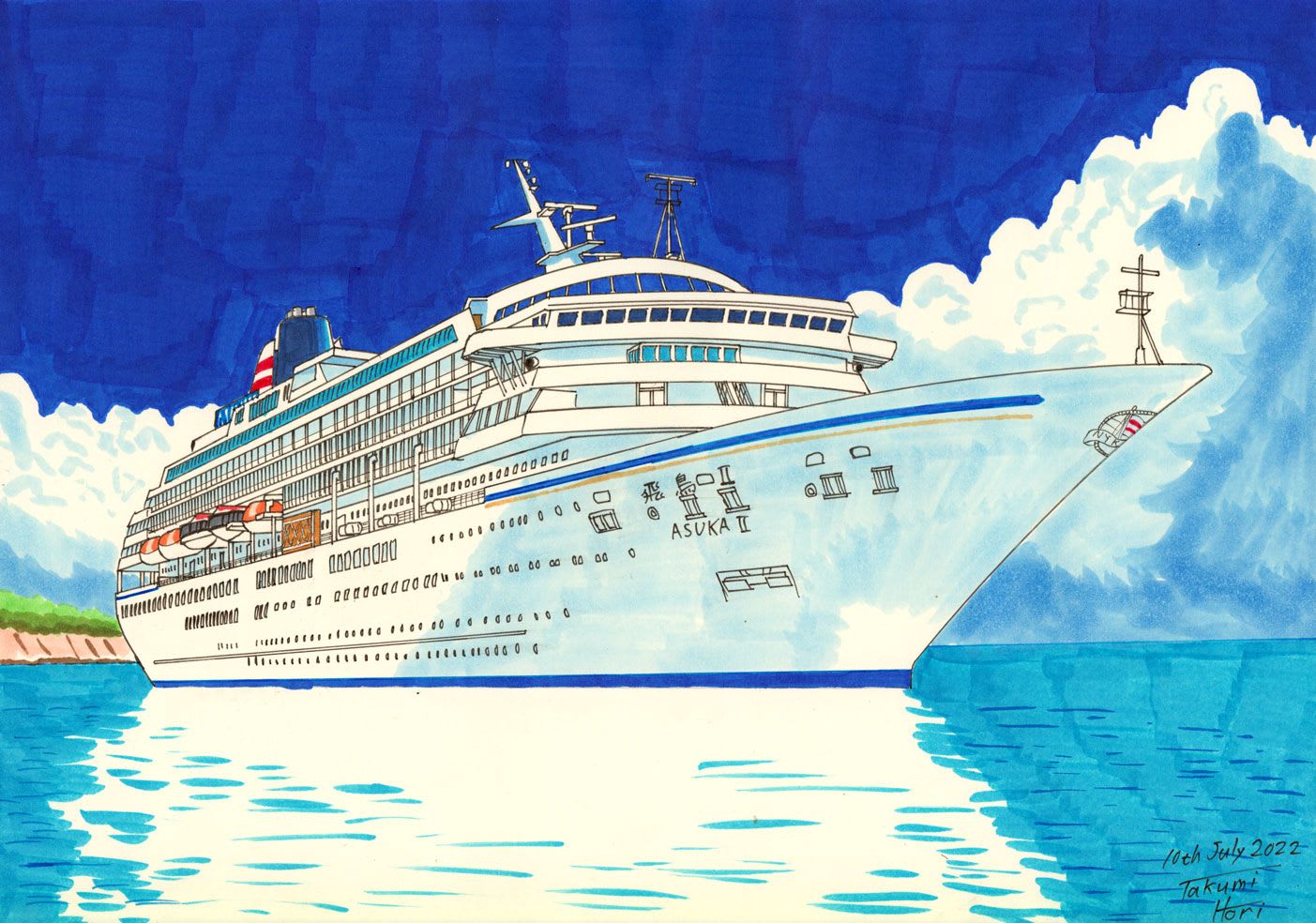 飛行機、列車、車もたくさん描きましたが、一番は洋上を優雅に進む客船です。