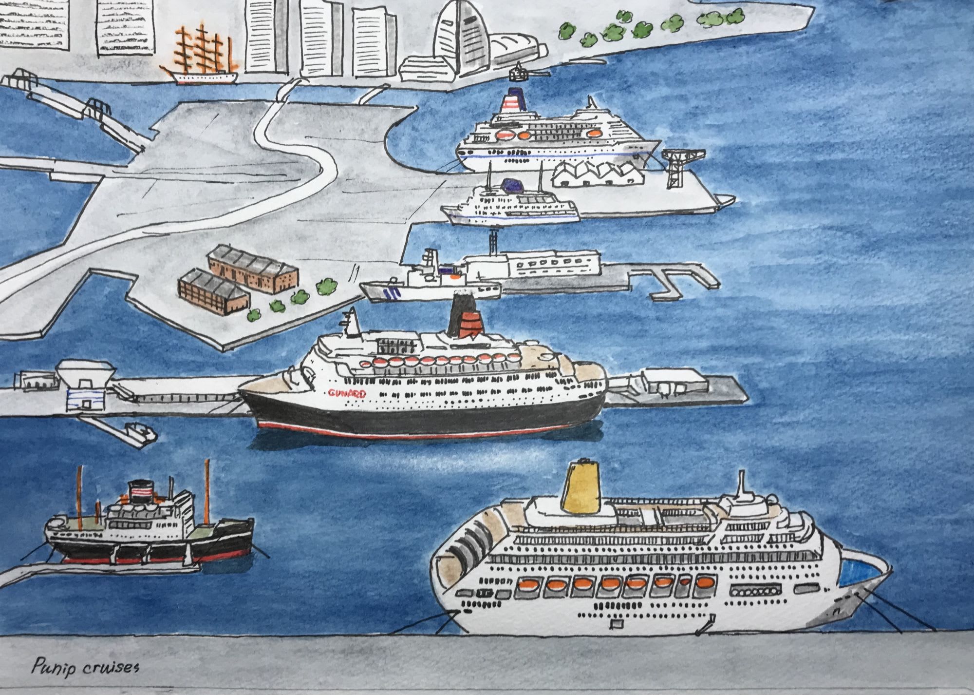 毎度ふざけたイラストで申し訳ないですが、ご覧になってお分かりのように当時、大さん橋は現在のターミナルになるための改装工事中でQE2一隻しか停泊できず、飛鳥が現在、横浜ハンマーヘッドと言う名前で再生した新港ふ頭ターミナル(私もこの前年にここから飛鳥に乗船しています)、オリアナは現在、動く実物大ガンダムを建造中の山下ふ頭に停泊していました。