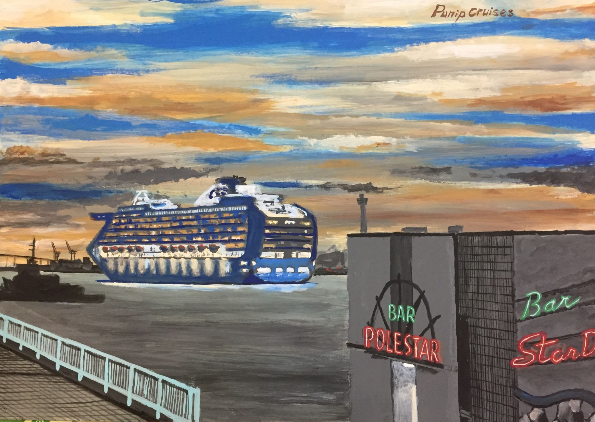 絵は新港ふ頭のハンマーヘッドを離岸してクルーズに出かけるダイヤモンドプリンセスを瑞穂埠頭の古いバーが並ぶ一角から見た風景ですが、実際にはこの高さから見る事は出来ません。