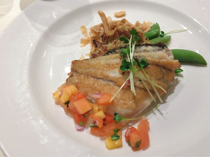メイン スズキ、パイナップルとパパイヤのサルサ添え