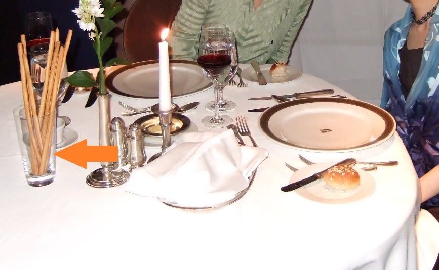 写真の、グラスに入った棒状の硬いパンで、見た目はグリッシーニに似ています。全て手作りで、その作業の様子は公式You Tube 「Making of Breadsticks」 (※注:外部サイト)でも見られます。3万トンクラスのオデッセイでは、1日1600本(!)も焼かれるとか。ネット上には、シーボーンのブレッドスティック、としてレシピも公開されており、その人気ぶりがうかがえます。ほんのり甘く、バターが香るサクサク生地で、周りにつぶつぶの岩塩がついています。甘さとしょっぱさ、食感が絶妙で、料理を待つ間にも、ついつい手が伸びてしまいます。ワイン好きの方なら、これだけでもワインがどんどんすすみそうです。