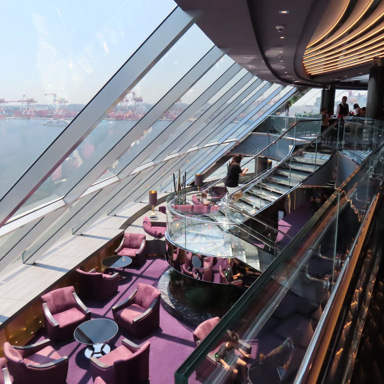 ヨットクラブは船首部のブリッジ真上の14~19デッキにあり、17万トンの巨大船の上にラグジュアリー船が乗っているような感じ。