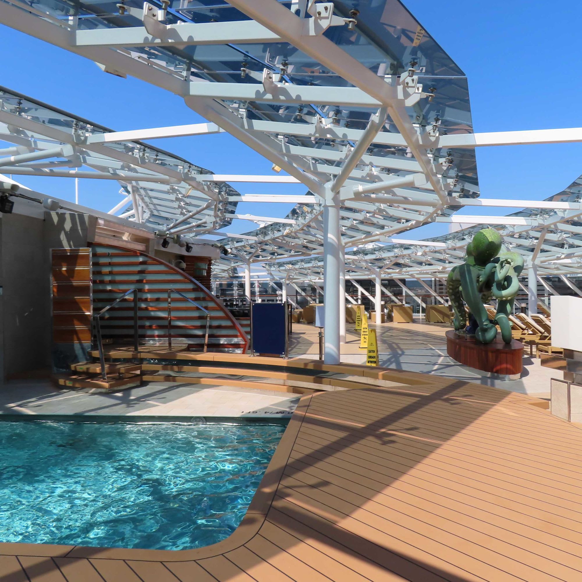 19デッキにはジャグジー、プールとグリル&バーがあり各種の軽食が用意され、飲み物もアルコールを含めて無料で飲むことができる。しかも自分専用みたいにゆったりと。(イタリアでは『17』は不吉な数字として忌み嫌われているのでデッキ17はない)