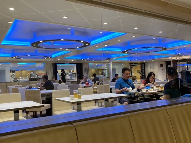 このフェリーは昼食としてカレーと牛丼のみ用意されていました。朝食にも朝カレーがあり、すでにいただいたので今一つ行く気がせず、商売気が全く無いのが残念です。メニューに魅力がないせいか殆ど人は居ません。