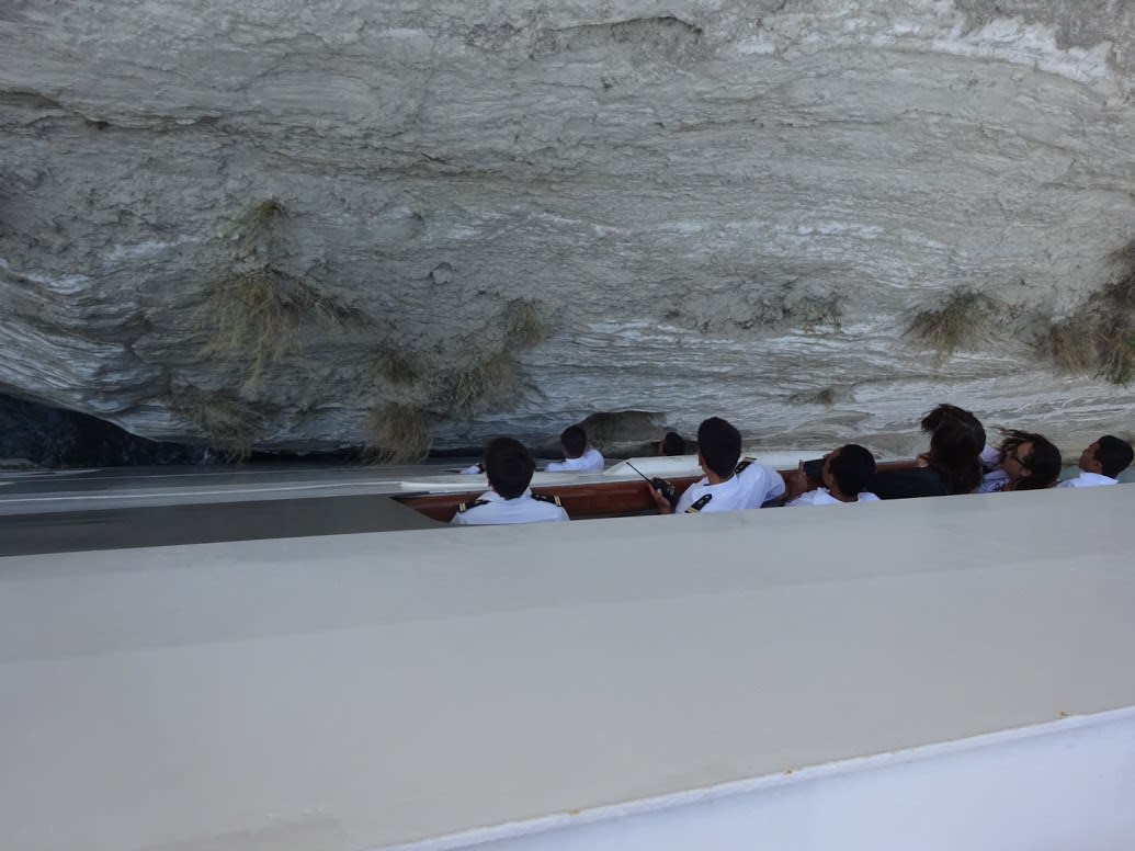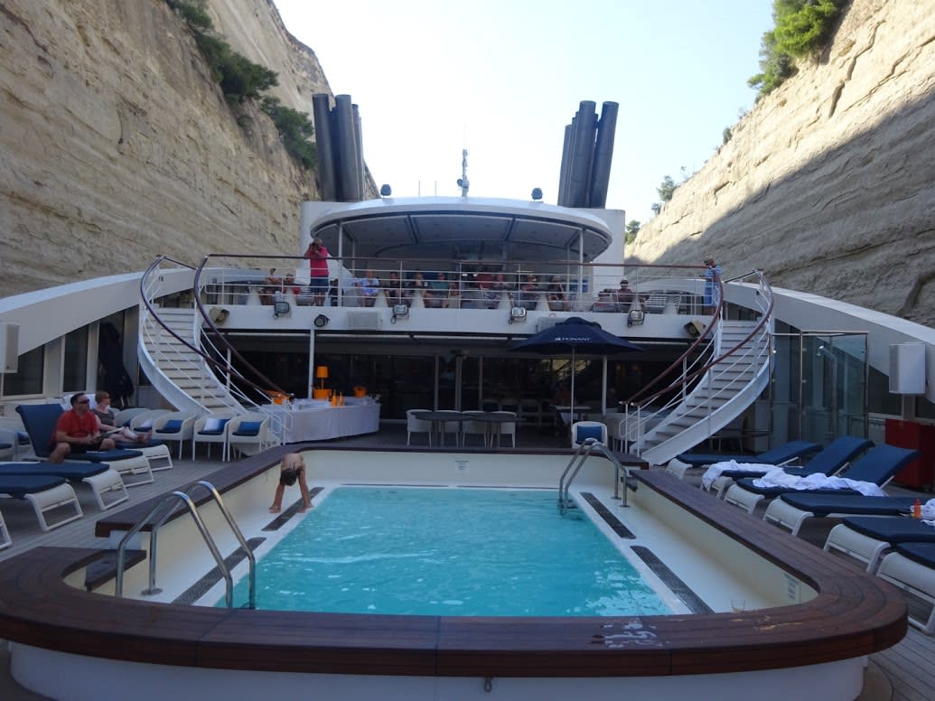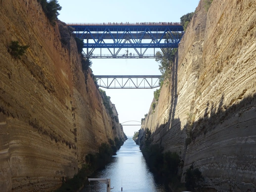 まもなくコリントス運河通過と、船内にアナウンスが入る。その前から先頭の特等席に陣とってましたけど何か?しかし予測外の強風だった。こんなに風が吹くなんて知らなかった。