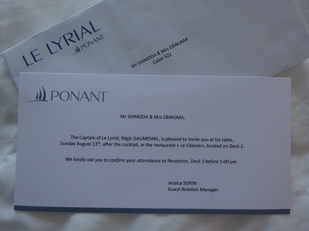 そう、キャプテンズテーブルへの招待状。間違い?名前を確認する。記載に間違いはない。二人で小躍りした。いや小躍りなんてしている場合ではない!正気に戻り身づくろいに時間をかける。時間かけたつもりだが早々に仕上がり時間をもてあましたので、またまたバーへ。興奮はしばらくつづく。